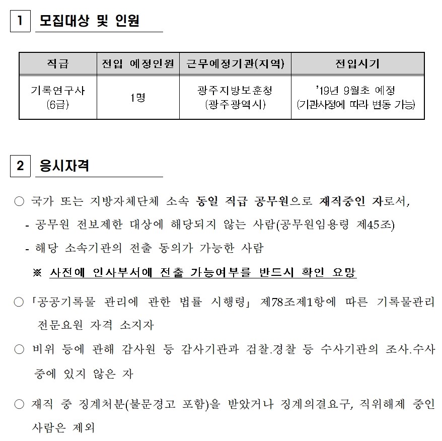 [안내] 광주지방보훈청 기록연구사 전입 희망자 모집 공고