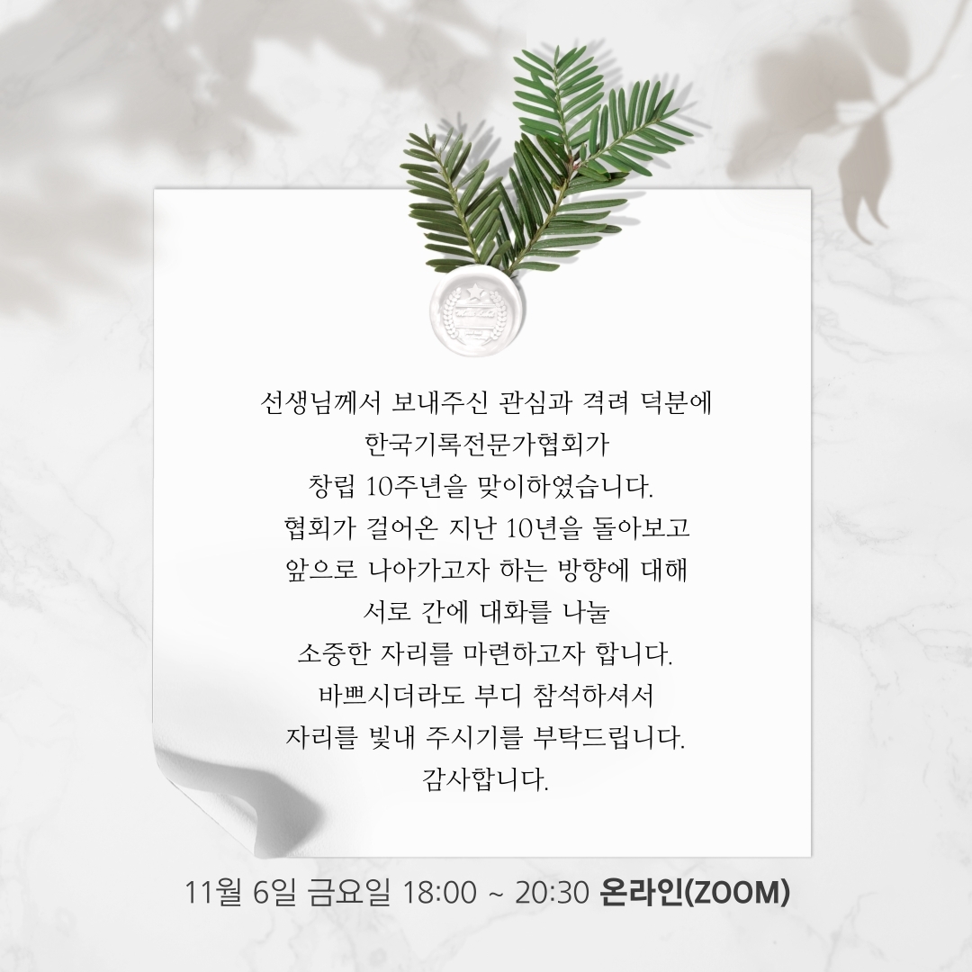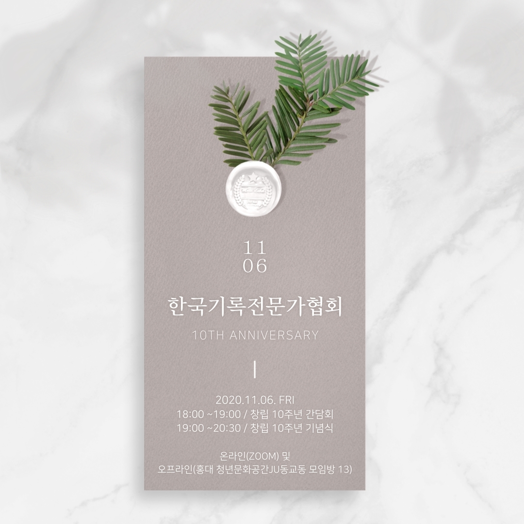 2010년 11월 6일에 창립한 한국기록전문가협회는 2020년 11월 6일 창립 10주년을 맞이합니다. 협회는 창립 10주년을 기념하며 지난 10년을 돌아보고, 앞으로의 10년을 준비하는 자리를 마련하였습니다. 2020년 11월 6일 금요일 오후 6시에 오프라인(홍대 청년문화공간JU동교동 모임방 13) 및 온라인(ZOOM)으로 진행할 예정이오니 바쁘시더라도 부디 참석하셔서 자리를 빛내 주시기를 부탁드립니다.