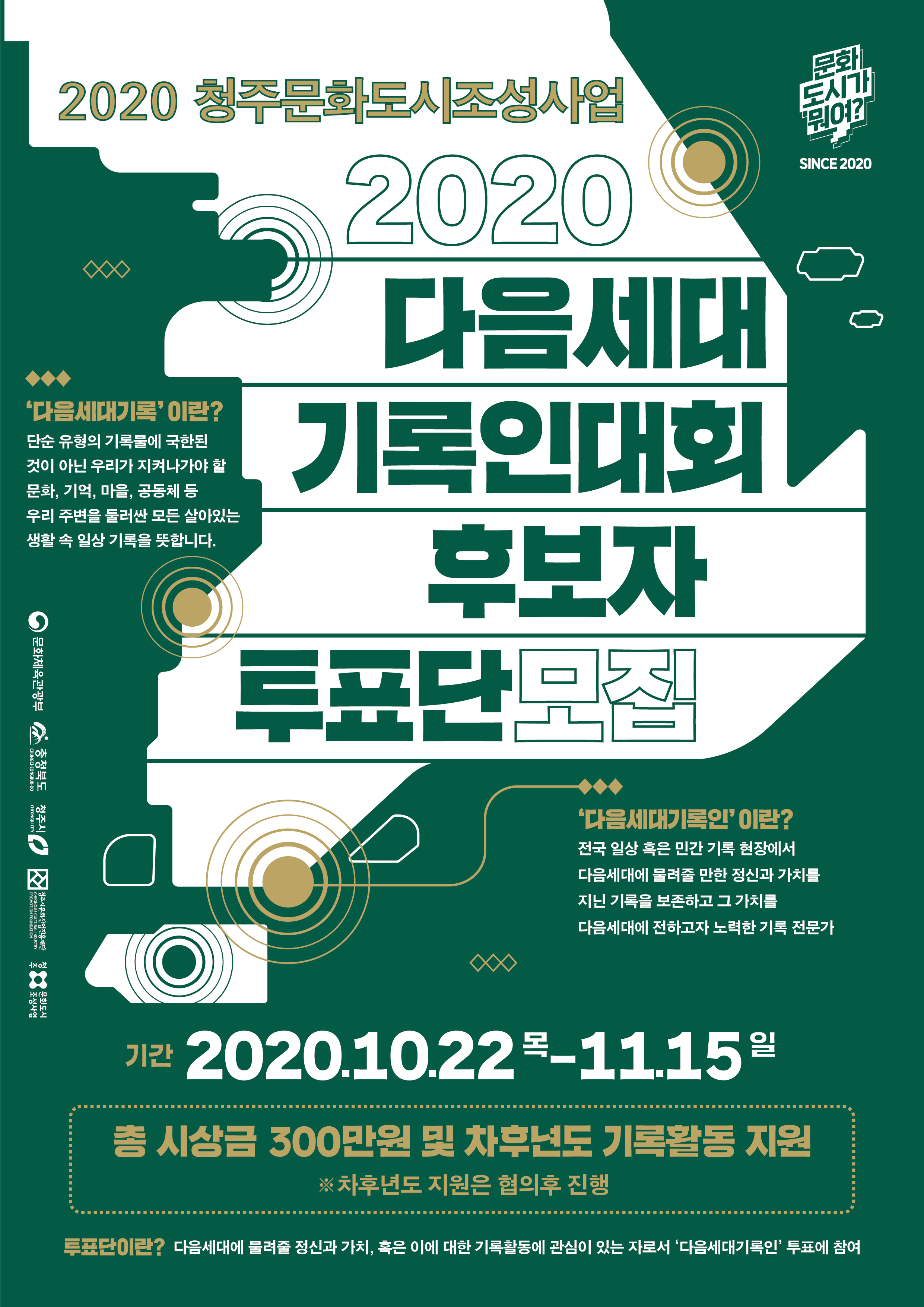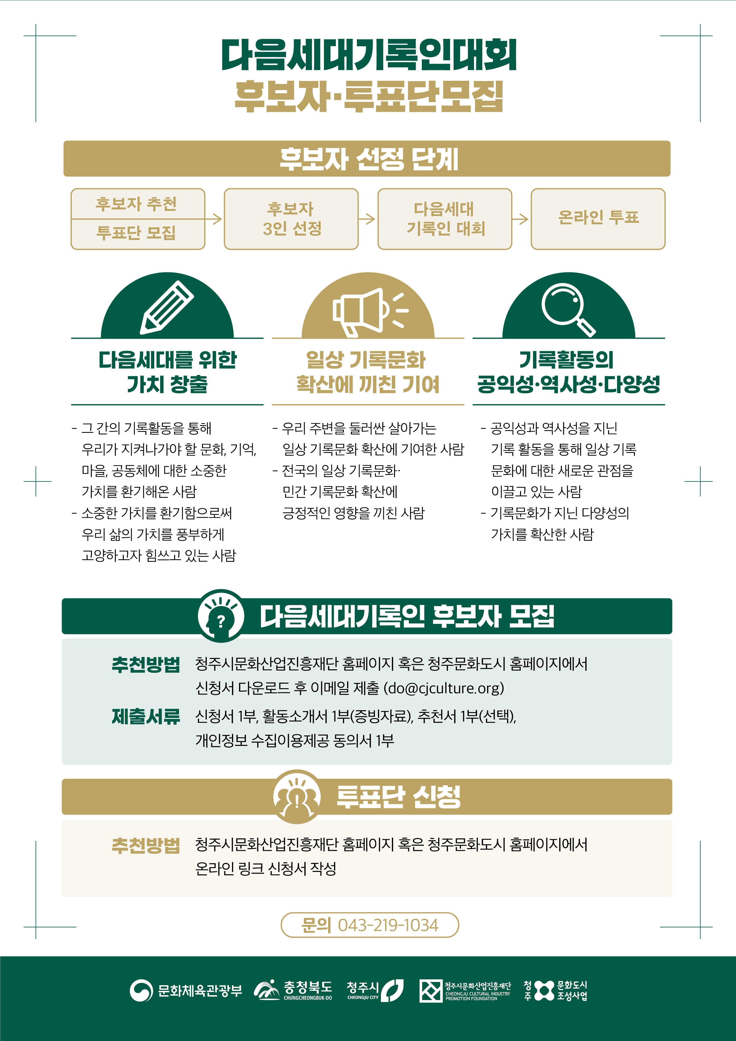 청주시에서는 전국 및 민간 기록 현장에서 다음 세대에게 전해줄 정신과 가치를 역사로 남겨줄 다음세대기록인과 성실히 임해줄 기록인을 날카로운 시선으로 선발해 줄 투표자들을 모집합니다.