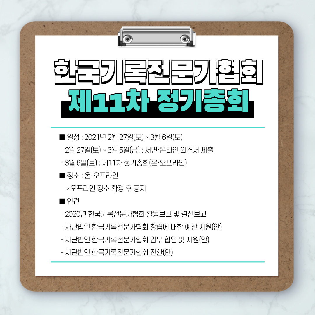 [공지] 제11차 한국기록전문가협회 정기총회 및 사단법인 한국기록전문가협회 창립총회 일정 안내