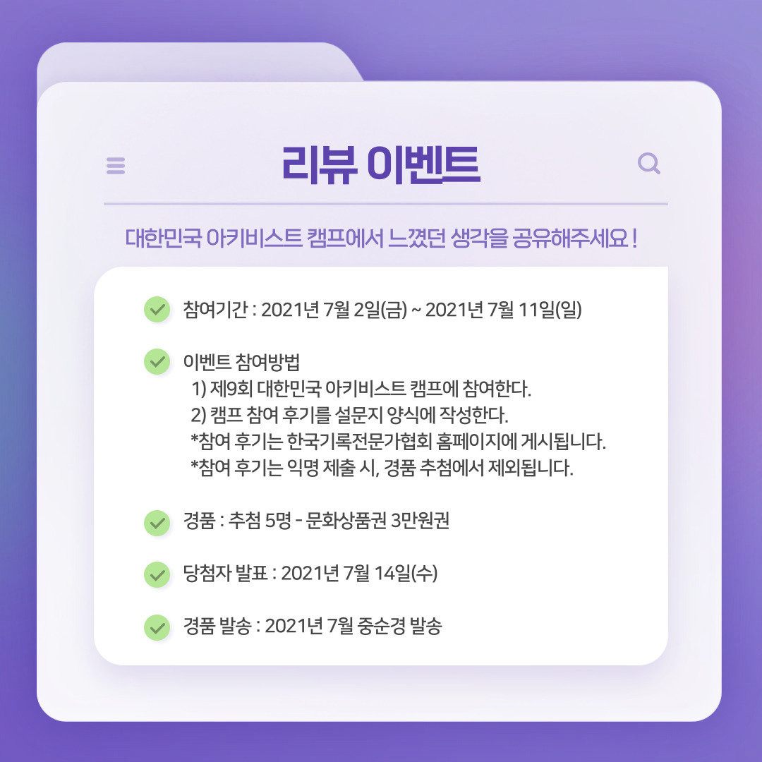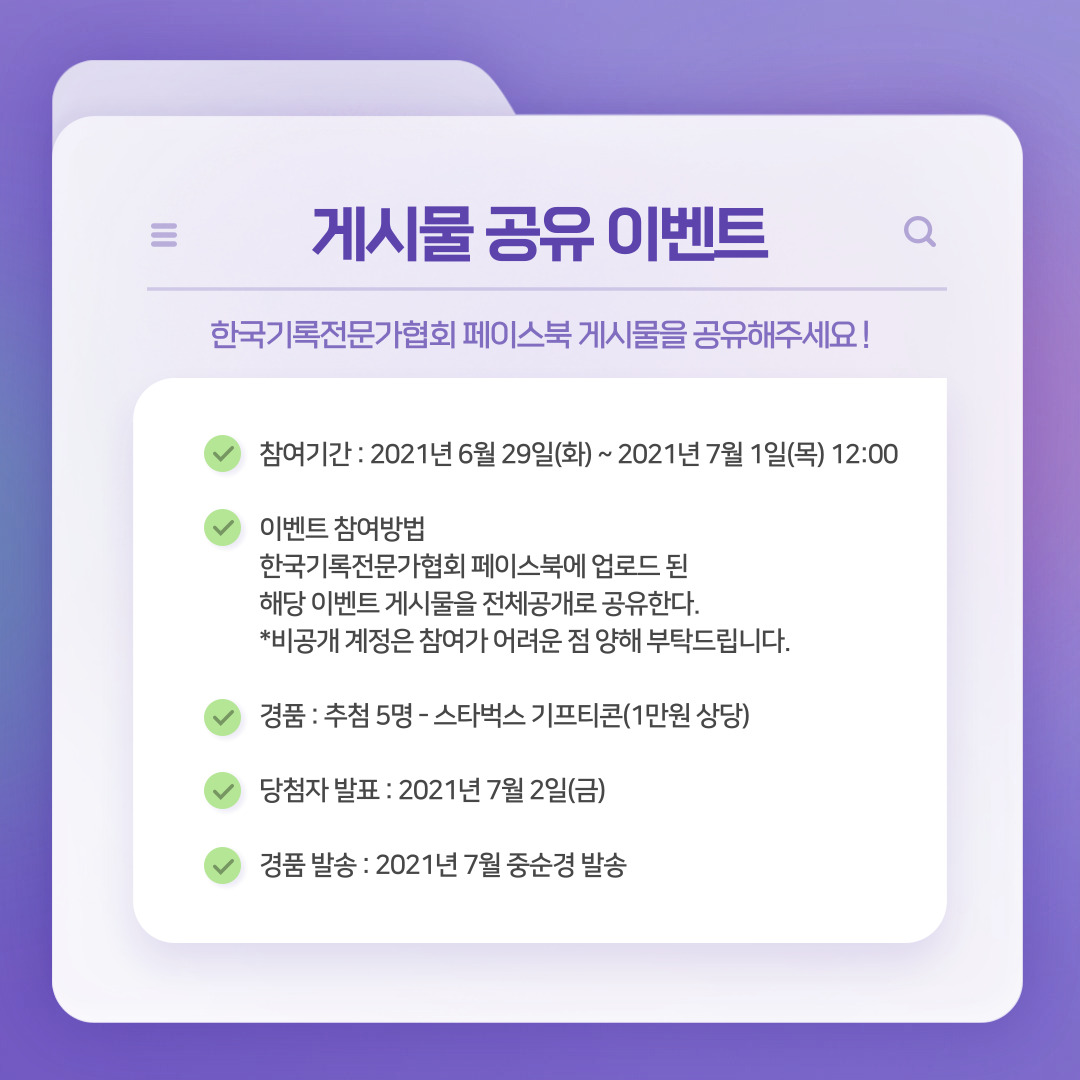 - 이벤트 참여방법 : 한국기록전문가협회 페이스북에 업로드 된 게시물을 전체공개로 공유한다.