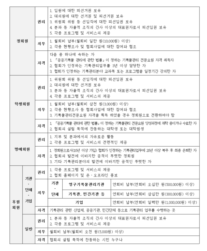 제1조(회원 권리․의무․자격) ① 사단법인 한국기록전문가협회(이하 “협회”라 한다)의 회원은 정관 제5조에 따라 협회의 취지에 찬동하는 자로 한다. 다만, 관련 분야의 전문성과 활동 경력 등에 따라 회원의 종류를 구분할 수 있다.