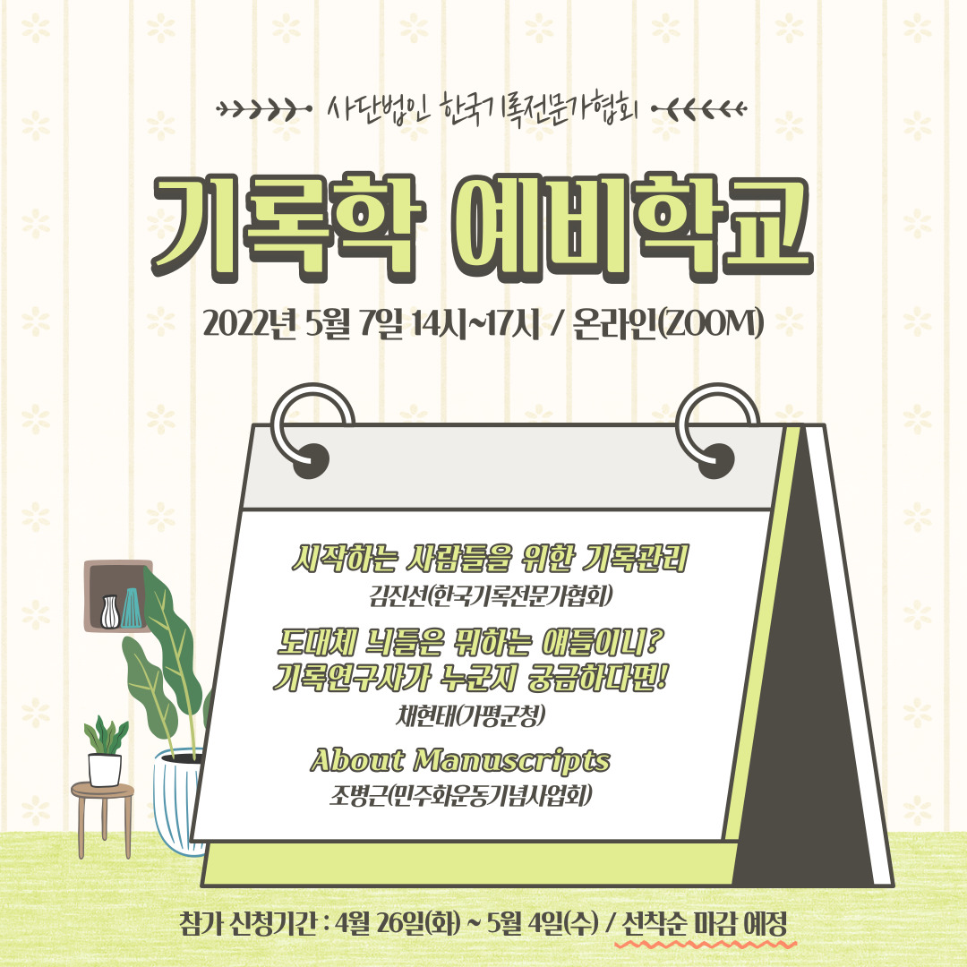 사단법인 한국기록전문가협회에서는 온라인 교육 프로그램인 '기록학 예비학교' 참가신청 마감이 5일 앞으로 다가왔습니다.