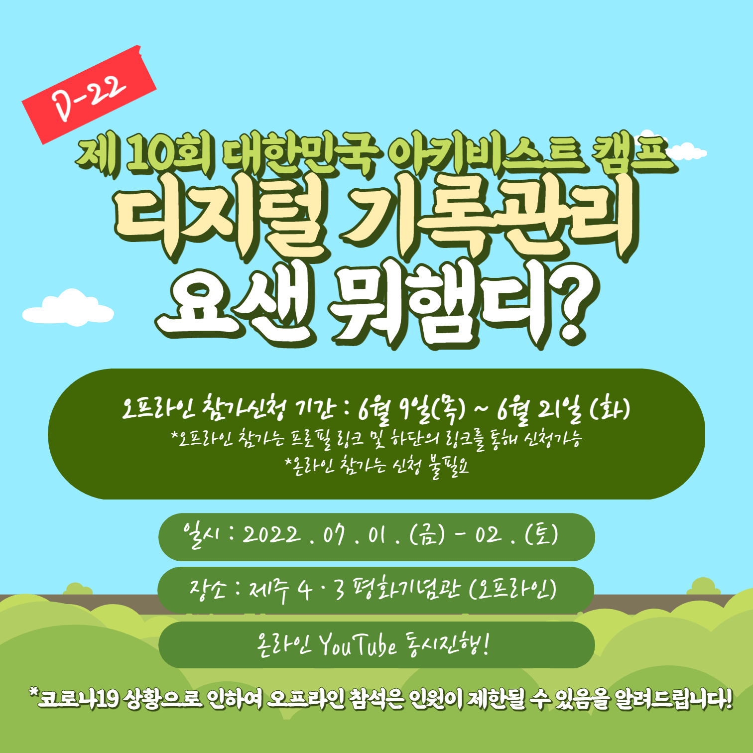 | 제10회 대한민국 아키비스트 캠프가 7월 1일(금) ~ 7월 2일(토)에 진행됩니다. 이번 캠프의 주제는 '디지털 기록관리 요샌 뭐햄디?(뭐하니?)' 입니다. 현재 디지털 기록관리 체계 전환에 따른 기록전문가의 역할에 대해 함께 이야기 하는 자리를 마련하였습니다. 제10회 대한민국 아키비스트 캠프는 더 많은 분들이 함께하실 수 있도록 온·오프라인으로 동시에 진행됩니다. 다만 코로나 19 상황에 따라 오프라인 참석 인원이 제한될 수 있으며, 오프라인 참가신청이 조기종료 될 수 있음을 안내드립니다. 이번 캠프는 10회를 맞이하여 더 다양하고 많은 이벤트를 준비하였습니다. 이벤트에도 많은 관심 부탁드립니다😀❤️ |