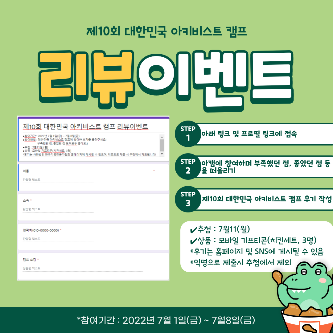 | [재공지] 제10회 대한민국 아키비스트 캠프 사후이벤트 참여기간 연장 (0) | 2022.07.08 |