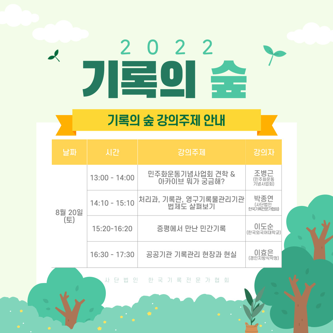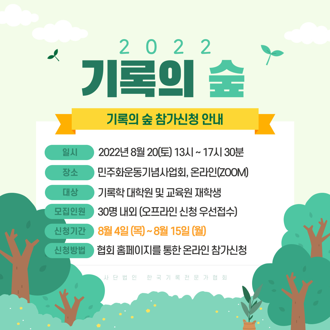 사단법인 한국기록전문가협회에서는 기록학 대학원 및 교육원 재학생을 대상으로 온·오프라인으로 '기록의 숲'을 진행합니다.