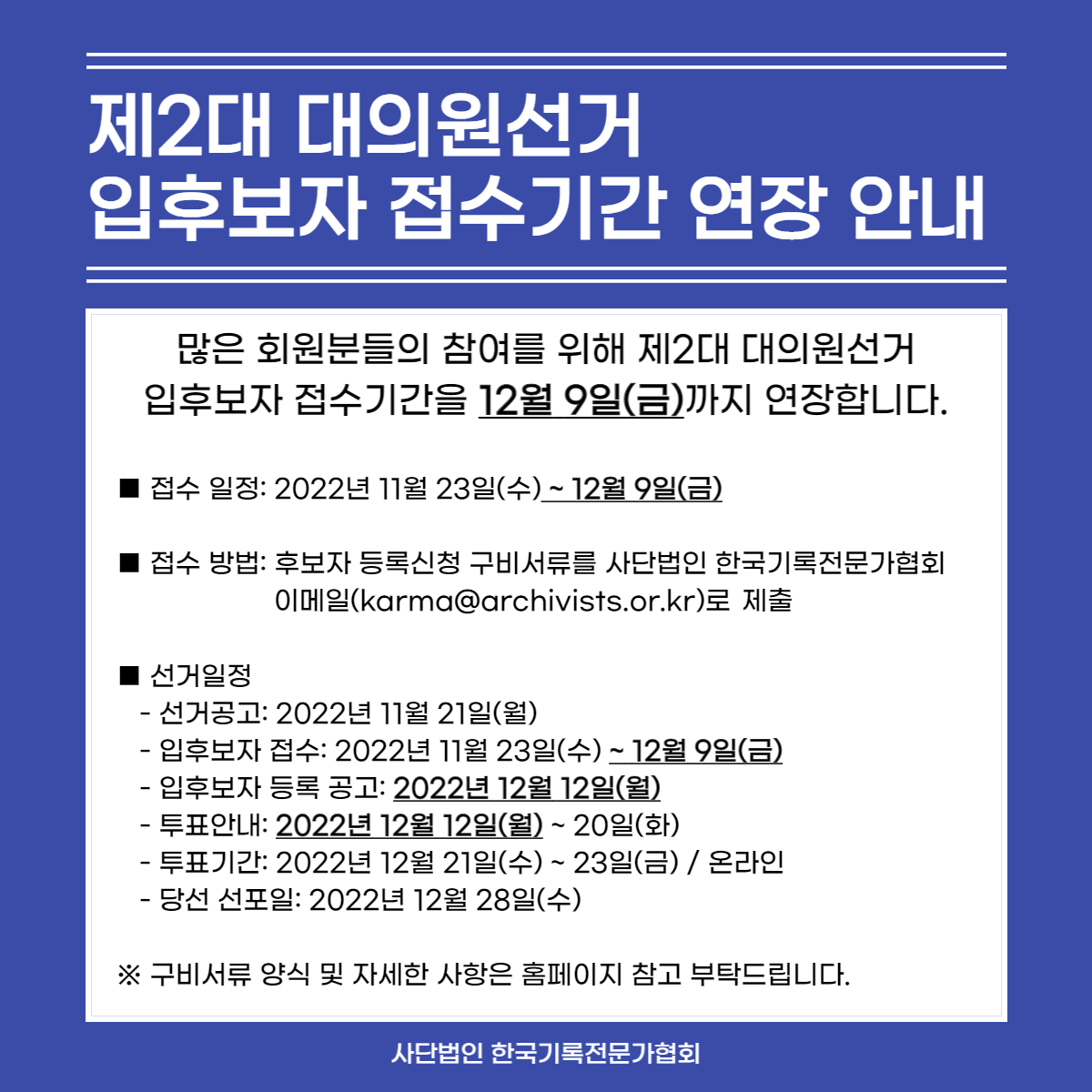 ■ 접수 방법: 후보자 등록신청 구비서류를 사단법인 한국기록전문가협회 이메일(karma@archivists.or.kr)로 제출
