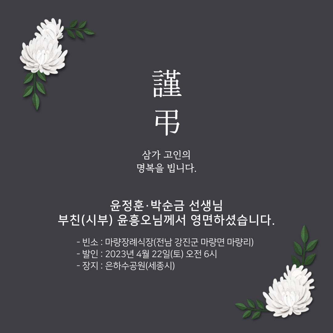 협회 회원이신 윤정훈·박순금 선생님의 부친(시부)께서 영면하셨습니다.