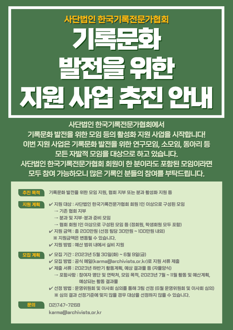 ✔ 지원 대상 : 사단법인 한국기록전문가협회 회원 1인 이상으로 구성된 모임
