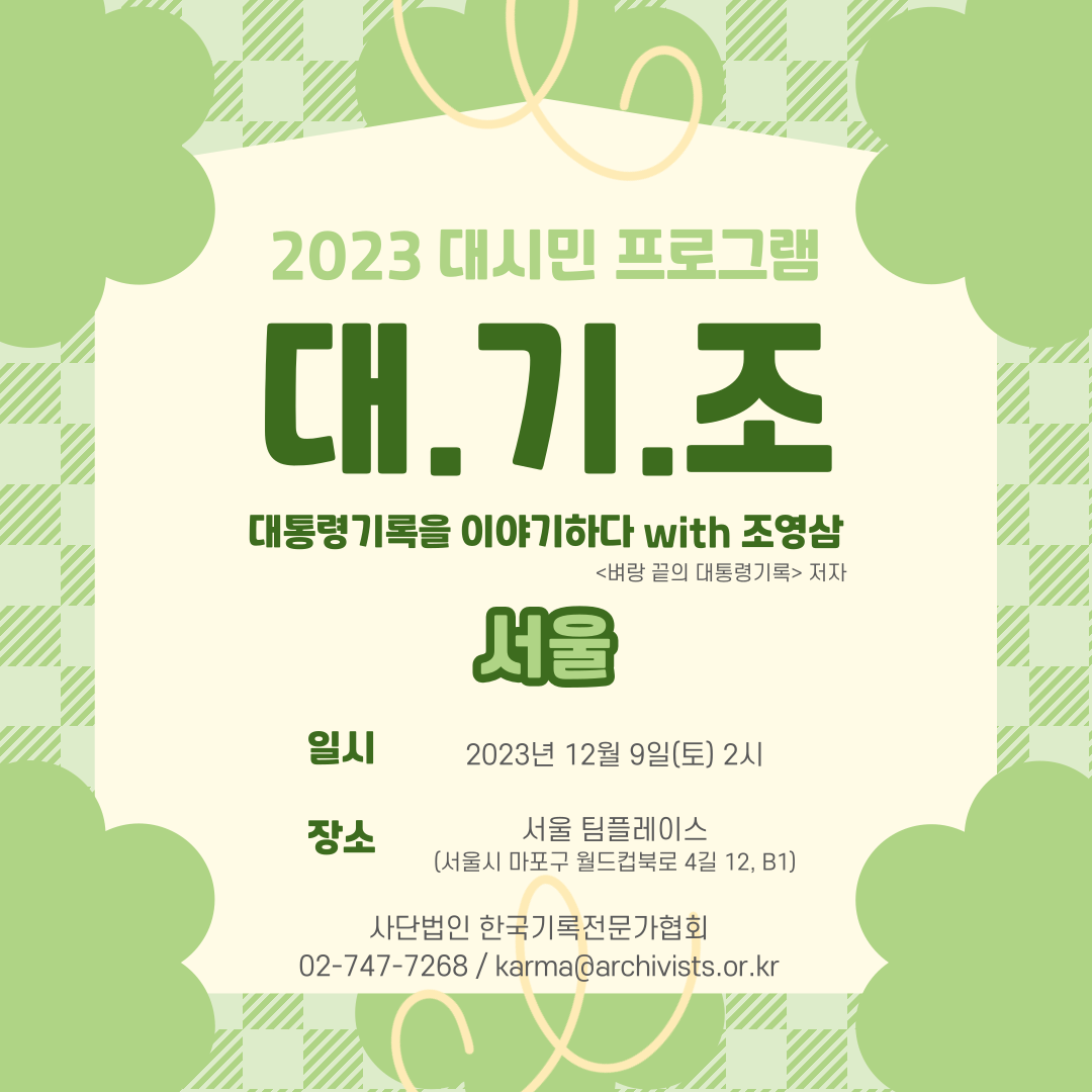 2023 대시민 프로그램 <대.기.조.>(대전, 서울) 사단법인 한국기록전문가협회는 매년 기록에 관심있는 일반 시민들이 기록을 접해 볼 수 있는 프로그램들을 운영하고 있습니다. 올해의 대시민 프