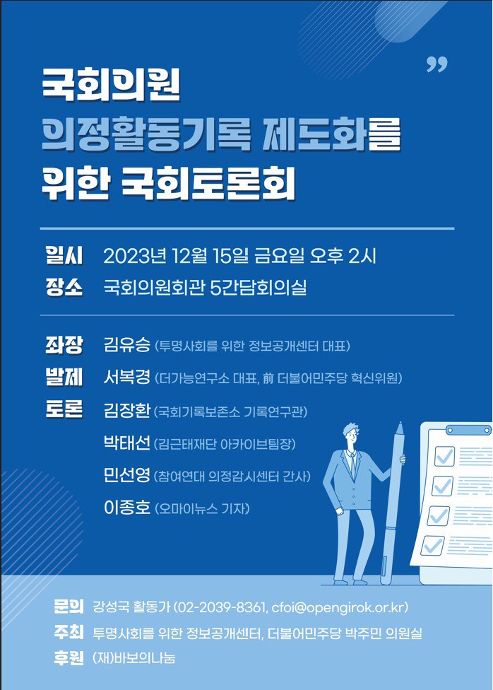 국회의원은 국민을 대변하는 의정활동을 하며 많은 공공기록물들을 입수하고 생산하고 이것들을 의정활동에 활용하고 또 의정활동 자체가 다시 기록물로 생산되고 있는데요. 국회의원실이 가지고 있는 이 많은 공공기록물들은 일부를 제외하면 아직 체계적으로 관리되고 있지 않아요. 이 정보들이 체계적으로 보존·관리되고 국민들에게 필요한 정보들이 공개된다면 의회정치가 더 발전하지 않을까요? 그래서 정보공개센터와 박주민 국회의원이 함께 준비했습니다. <21대 국회의원실록 캠페인> 국회의원의정활동 제도화를 위한 국회토론회! 국회의원 의정활동기록 관리 현황과 앞으로 어떤 과제가 있을지 함께 이야기 나눠봅니다.