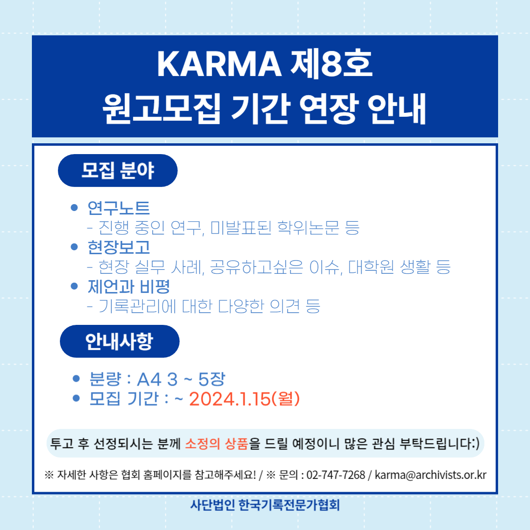 사단법인 한국기록전문가협회 기관지 KARMA 제8호 원고모집 기간을 연장합니다.