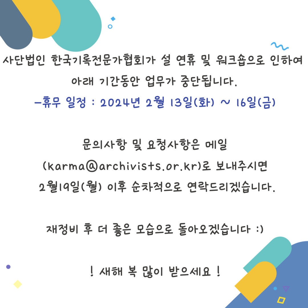 사단법인 한국기록전문가협회가 설 연휴 및 워크숍으로 인하여 아래 기간 동안 업무가 중단됩니다.