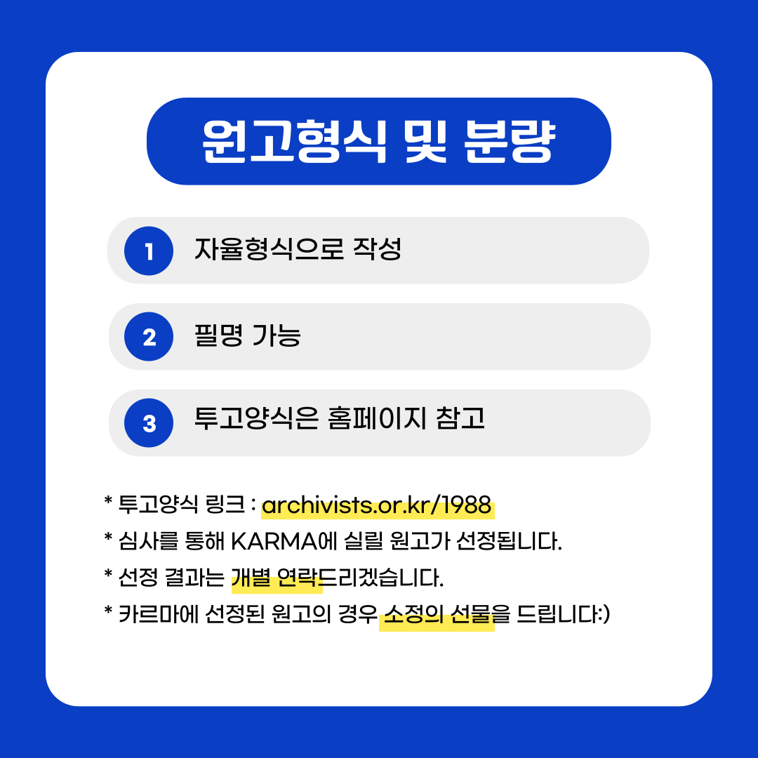 ※ 카르마에 선정된 원고의 경우 소정의 선물을 드립니다.