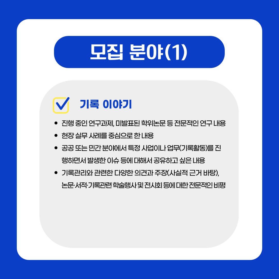- 기록관리와 관련한 다양한 의견과 주장(사실적 근거 바탕), 논문·서적·기록관련 학술행사 및 전시회 등에 대한 전문적인 비평