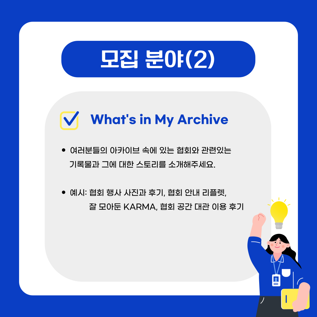 - 예시: 협회 행사 사진과 후기, 협회 안내 리플렛, 잘 모아둔 KARMA, 협회 공간 대관 이용 후기