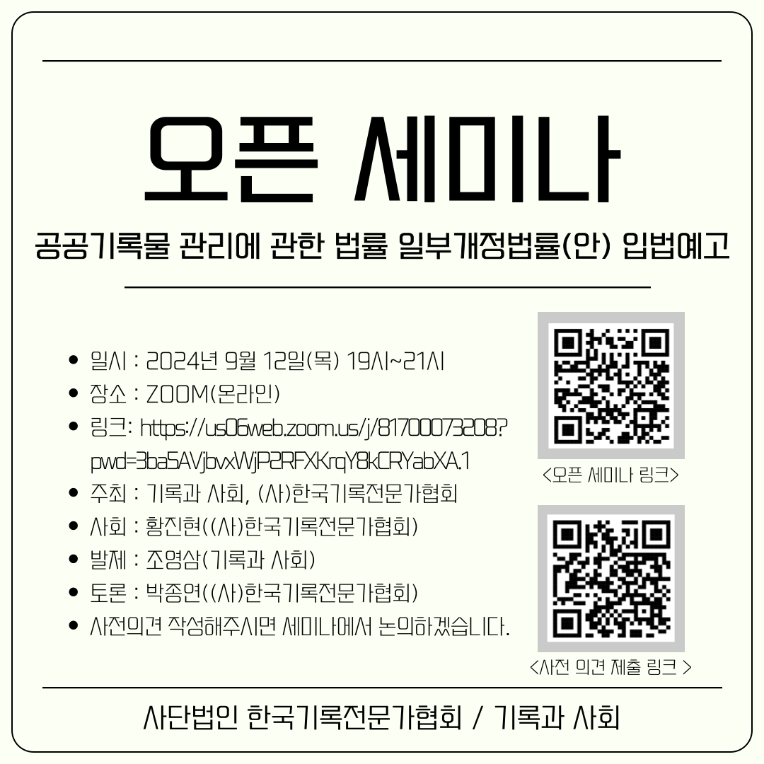 2024년 9월 12일 목요일 오후 7시, ⌈공공기록물 관리에 관한 법률⌋ 일부개정법률(안) 입법예고 관련 오픈 세미나가 온라인(ZOOM)으로 진행됩니다.