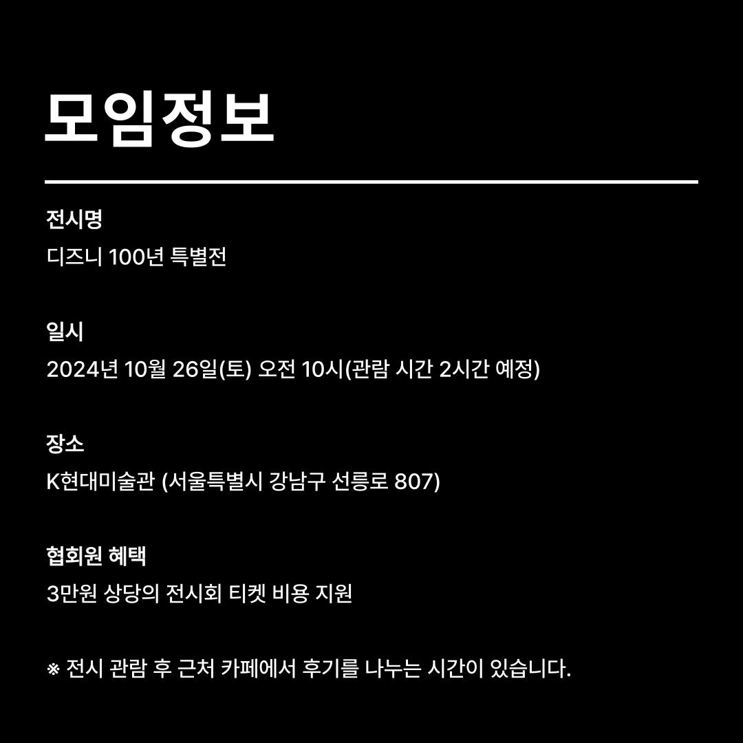 - 주의사항: 전시 특성 상 예매가 필수입니다. 예매 취소 시 소중한 협회비가 취소 수수료로 빠져나갈 수 있으니 신청하신 분들께서는 필참해주시기 바랍니다. 🙏