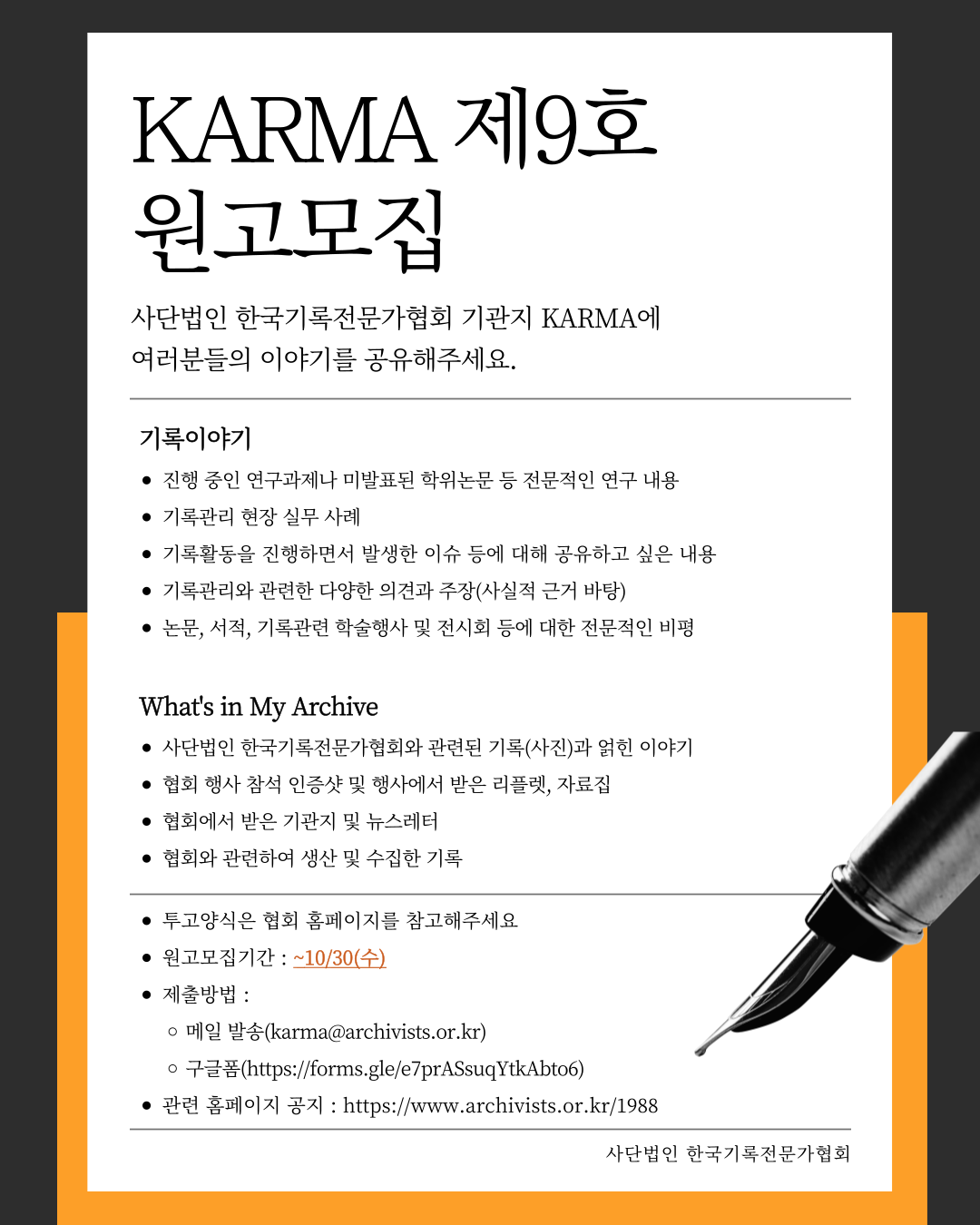 사단법인 한국기록전문가협회 기관지 KARMA 제9호 원고 모집 기한이