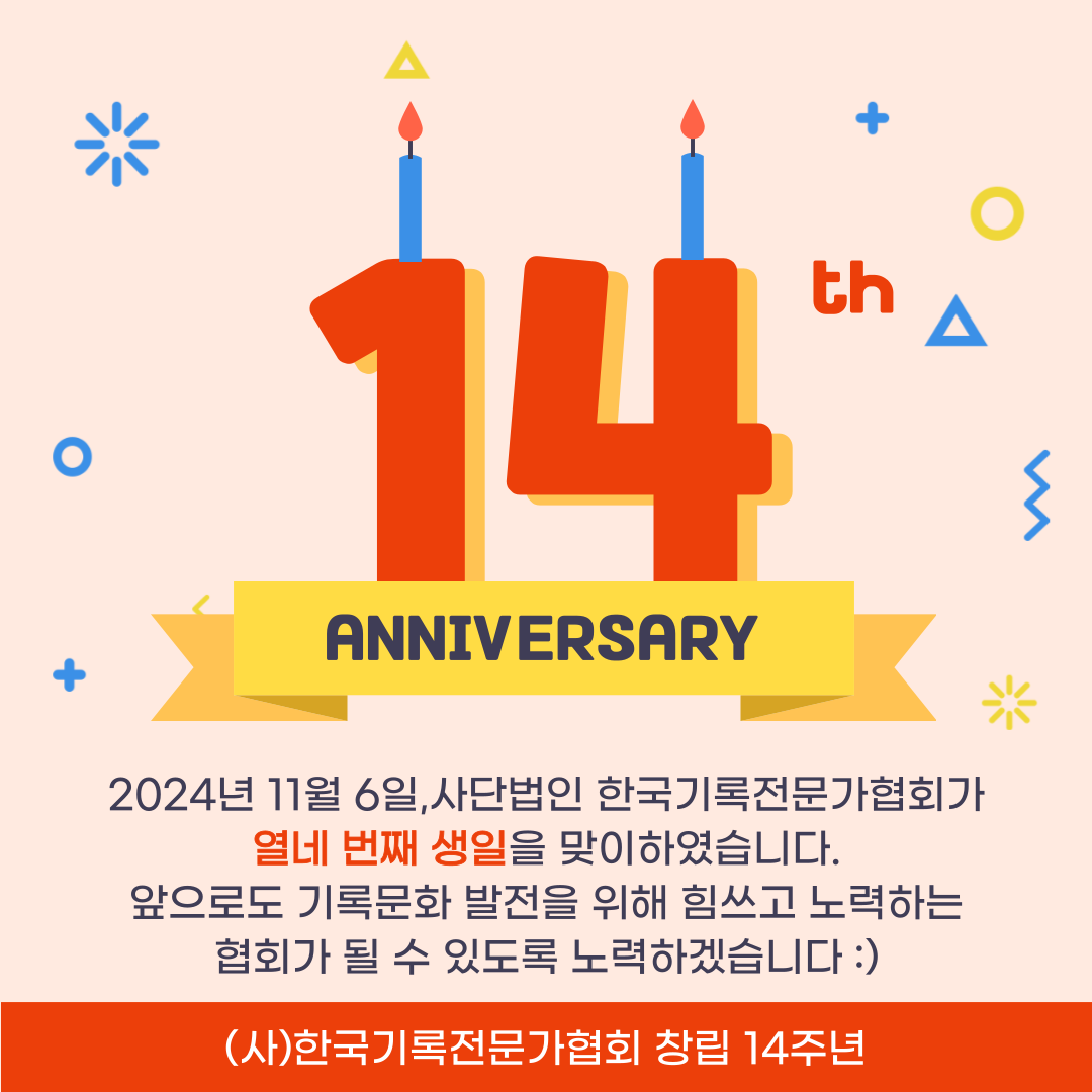 2024년 11월 6일, 사단법인 한국기록전문가협회가 열네 번째 생일을 맞이하였습니다😄