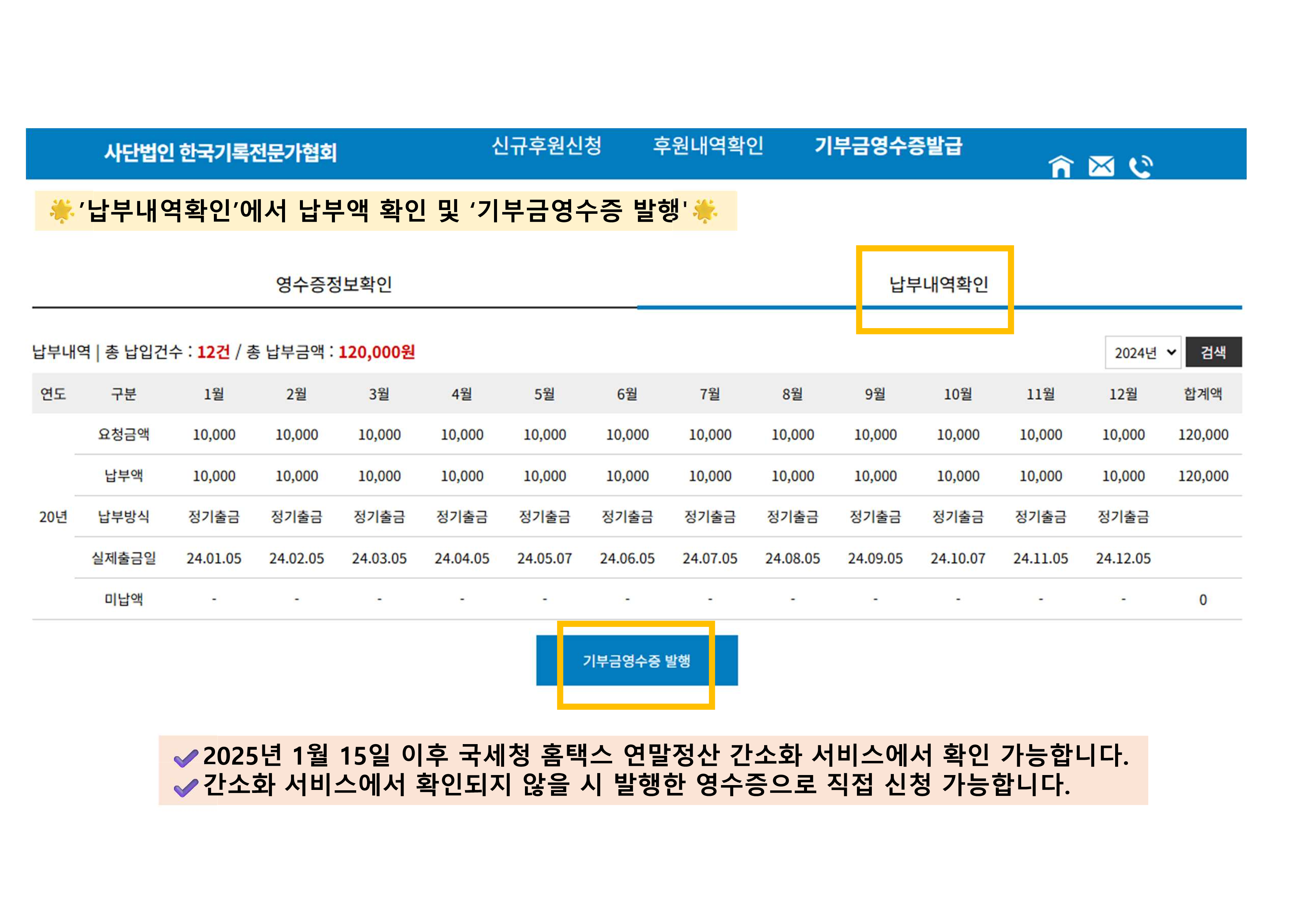 아래의 내용을 참고하시어 2024년 협회비에 대한 기부금 영수증 발급을 신청해주시기 바랍니다.
