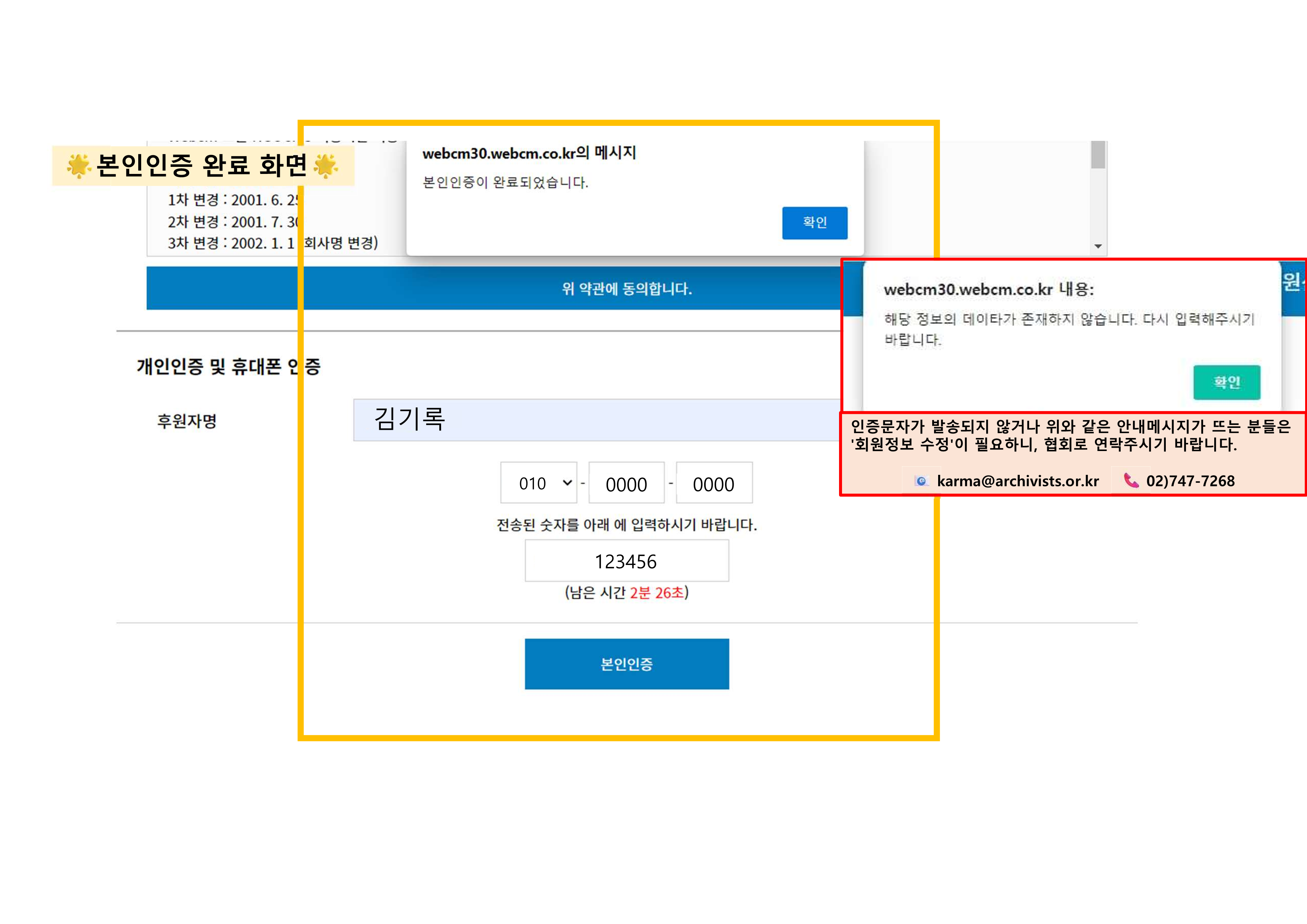 *인증문자가 시간 내에 발송되지 않거나 '해당 정보의 데이터가 존재하지 않는다'는 안내메시지가 뜨는 경우, 회원정보수정이 필요하오니 협회로 연락주시기 바랍니다(02)747-7268 / karma@archivists.or.kr).