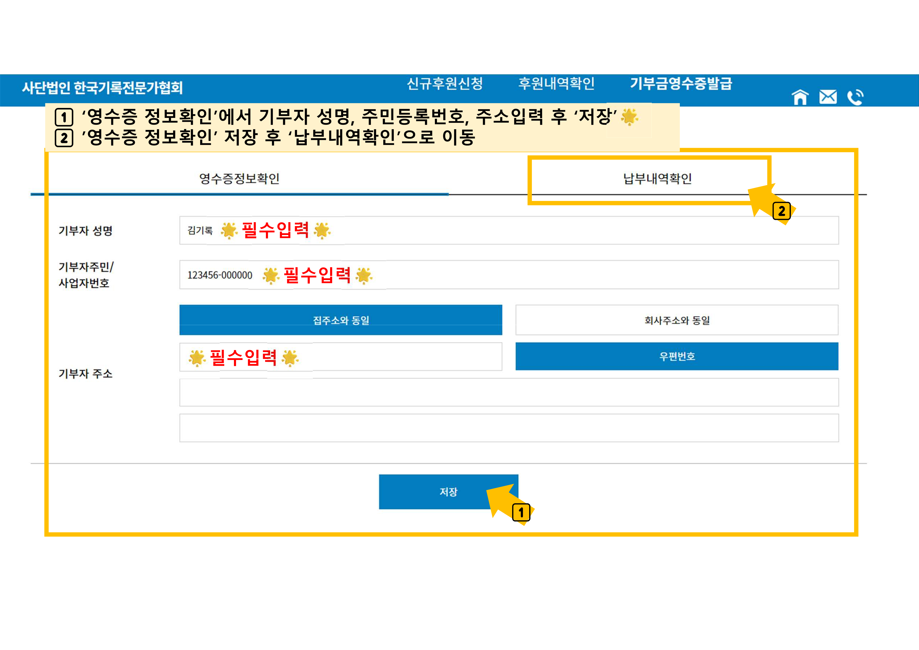 4️⃣'영수증 정보확인'에서 기부자성명, 주민등록번호, 주소 입력 후 저장버튼 클릭, '납부내역확인'으로 이동