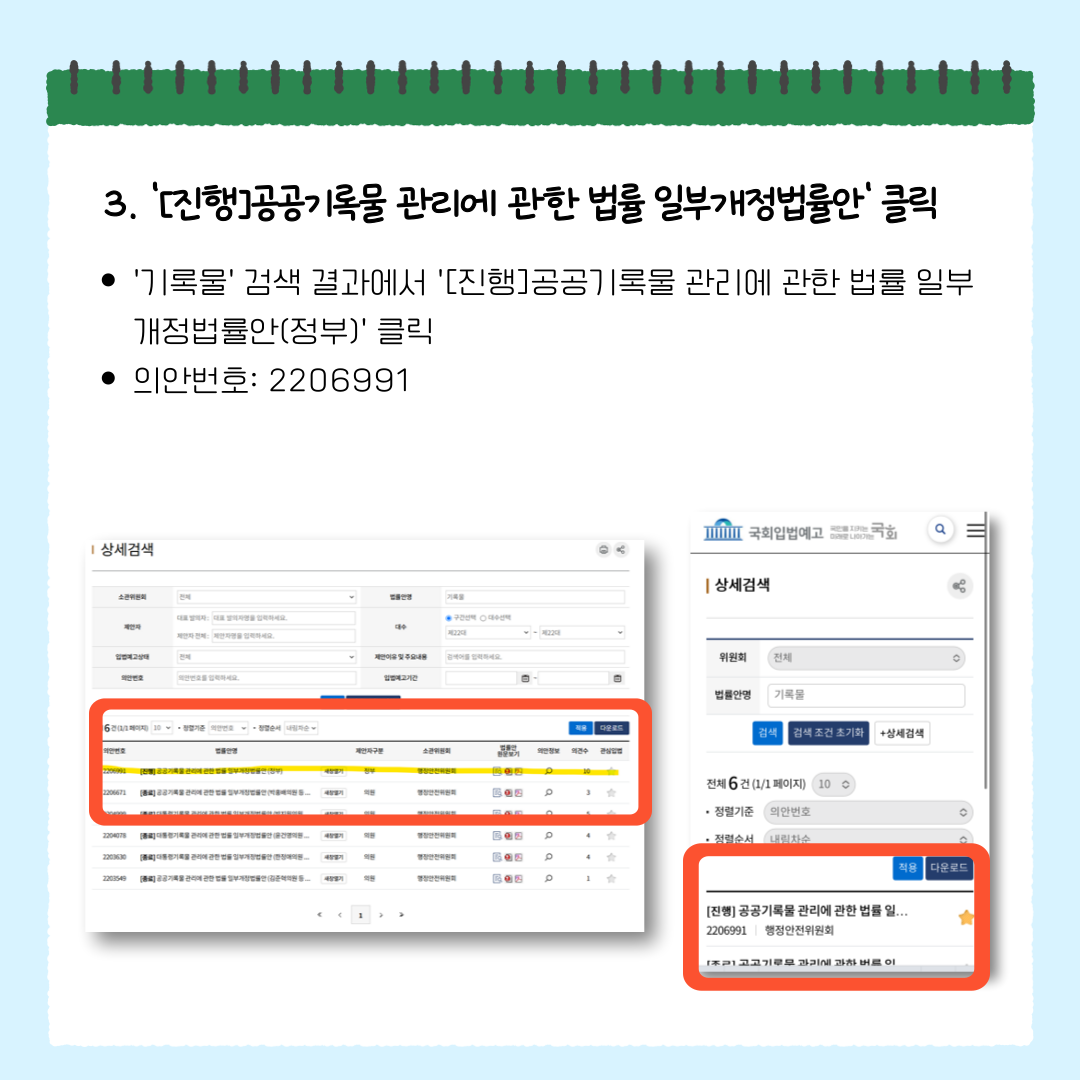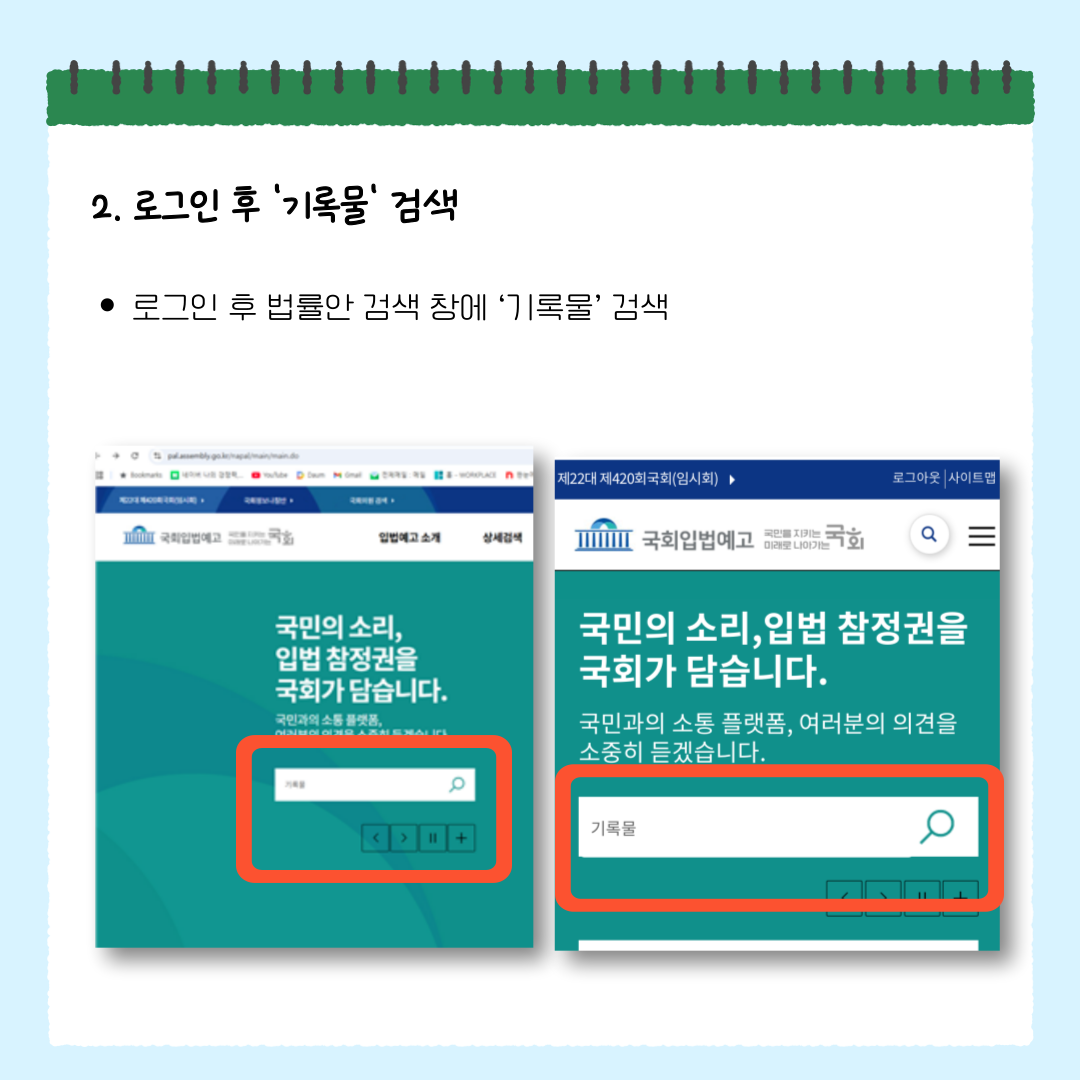 2️⃣ 로그인 후 법률안 검색 창에 ‘기록물’ 검색