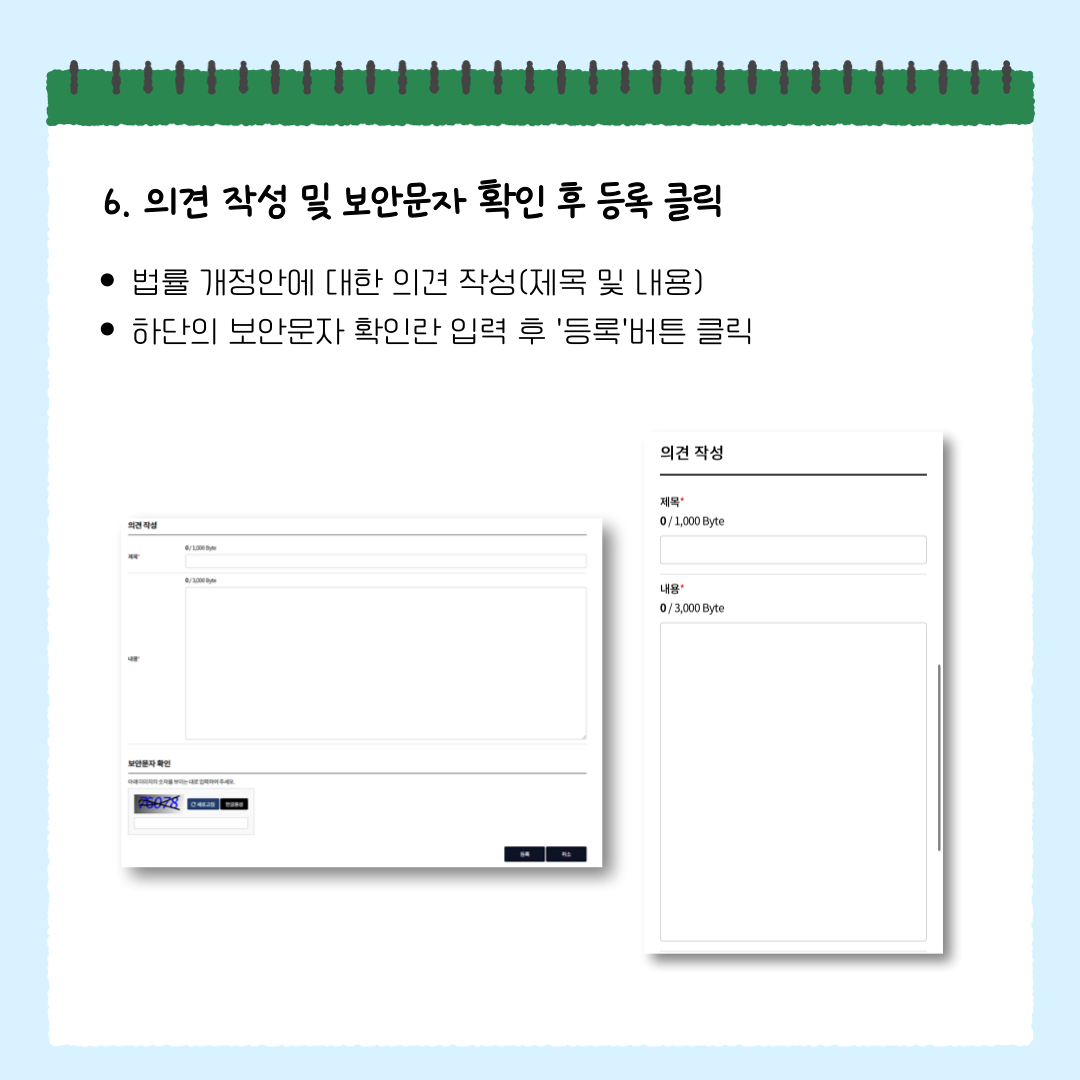 6️⃣ 의견 작성(제목 및 내용) 및 보안문자 확인 후 '등록' 클릭