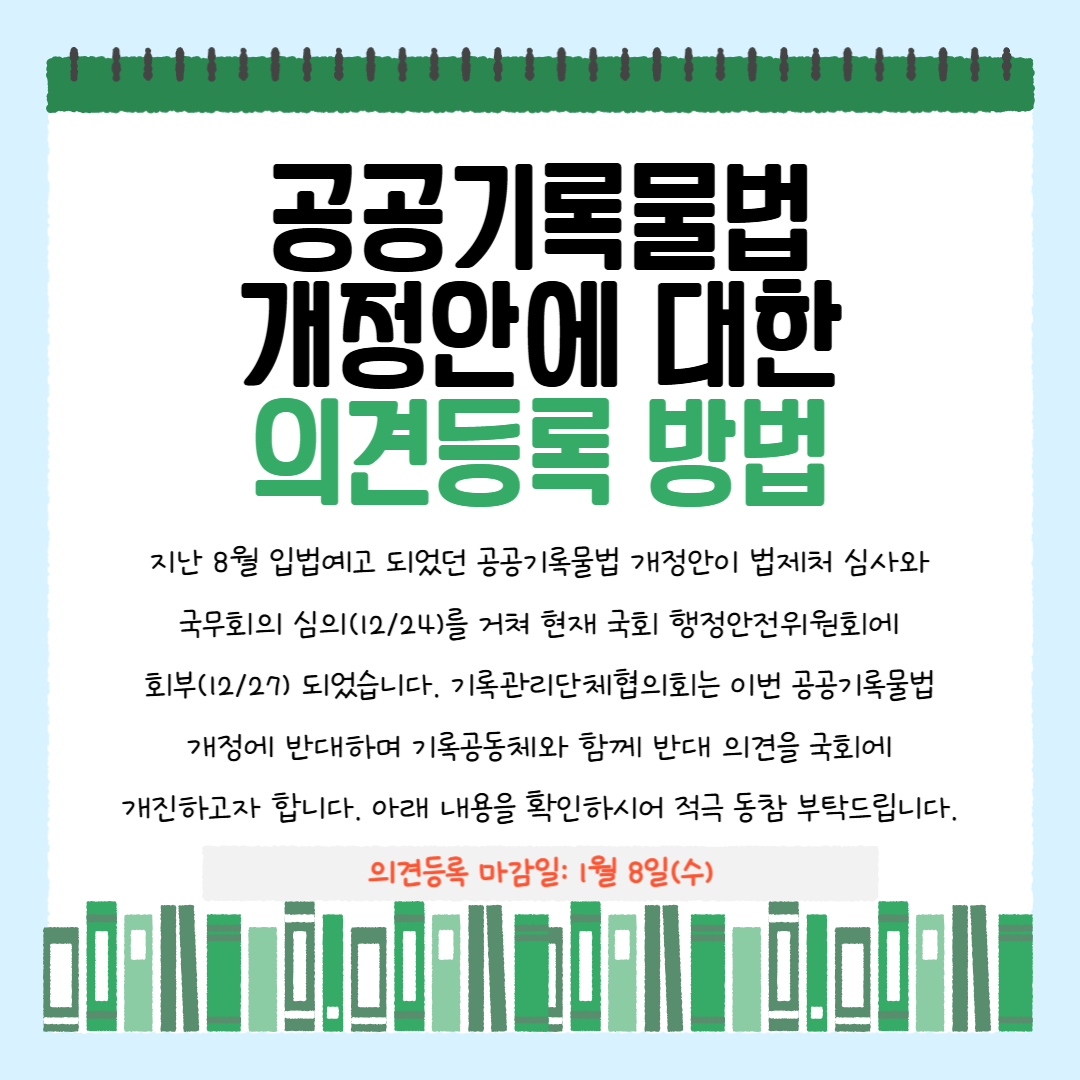 지난 8월 입법예고 되었던 공공기록물법 개정안이 법제처 심사와 국무회의 심의(12/24)를 거쳐 현재 국회 행정안전위원회에 회부(12/27) 되었습니다. 기록관리단체협의회는 이번 공공기록물법 개정에 반대하며 기록공동체와 함께 반대 의견을 국회에 개진하고자 합니다. 아래 내용을 확인하시어 적극 동참 부탁드립니다.