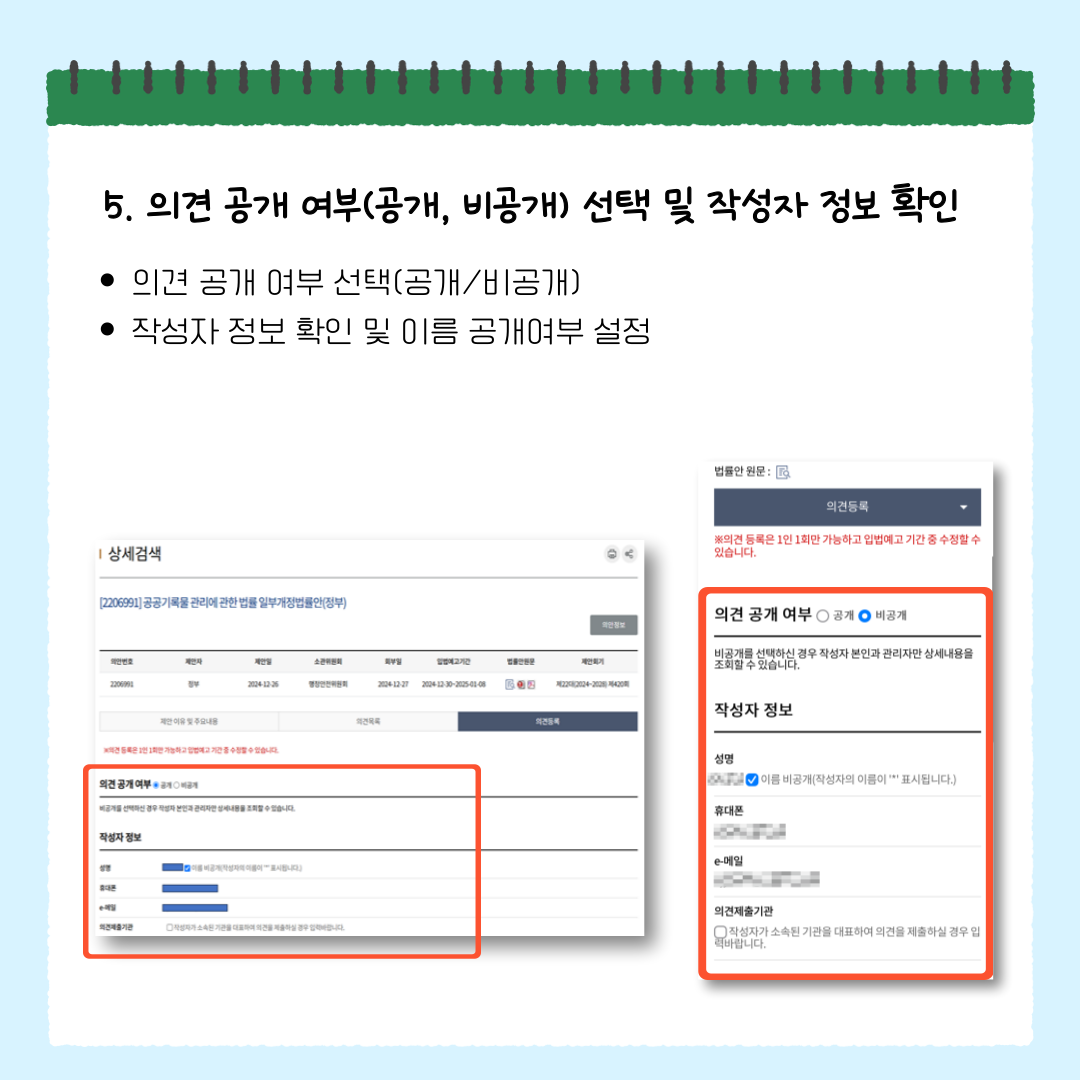 5️⃣ 의견 공개 여부(공개, 비공개) 선택 및 작성자 정보 확인