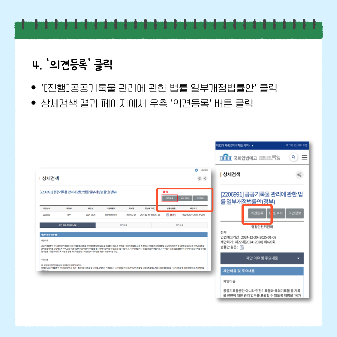 4️⃣ 상세검색에서 '의견등록' 클릭