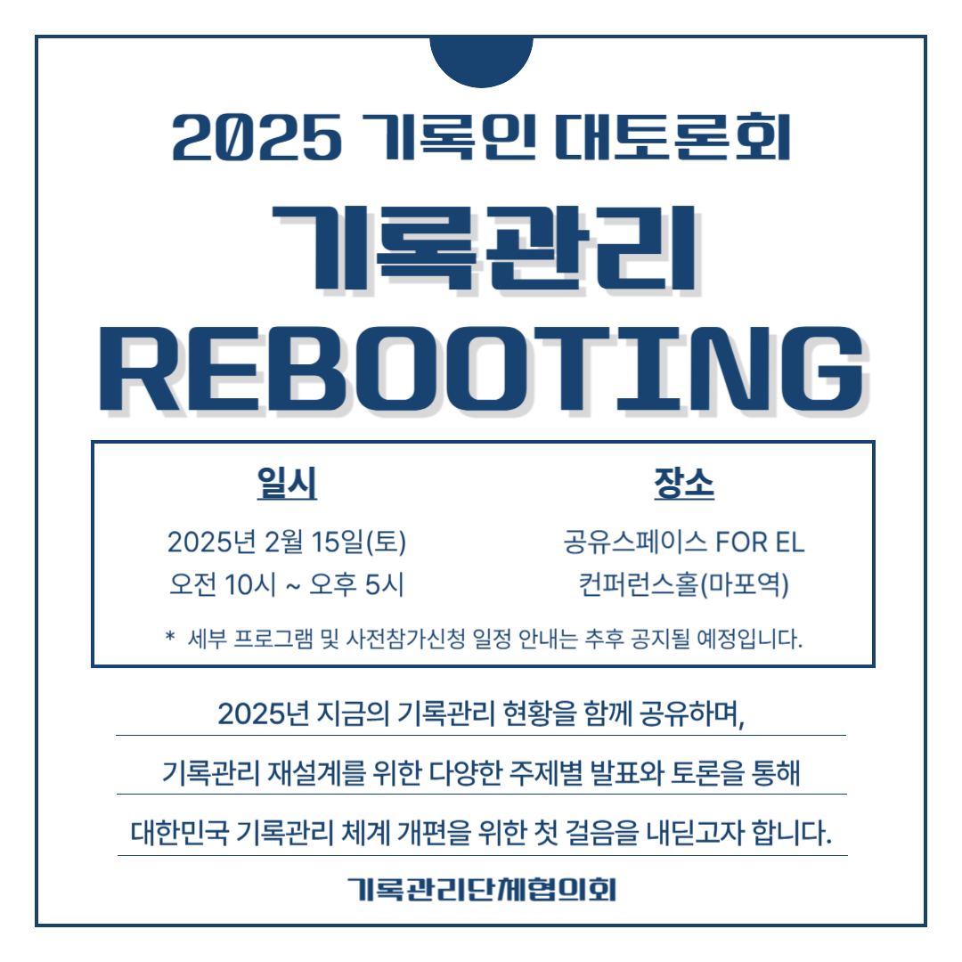 사단법인 한국기록전문가협회를 포함한 7개의 기록단체가 함께하는 기록관리단체협의회에서 <2025 기록인 대토론회: 기록관리 REBOOTING>를 개최합니다.