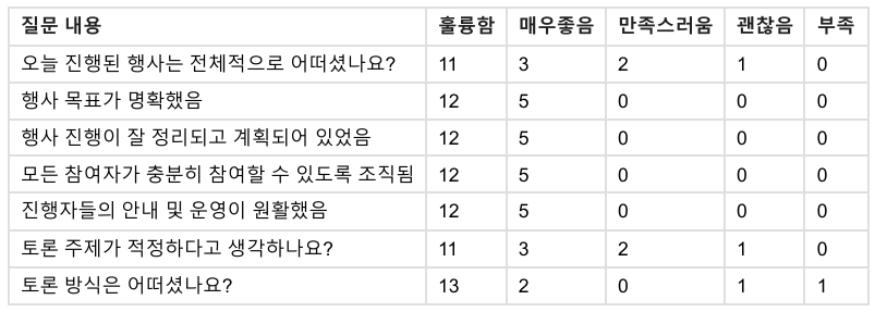 - 시간이나 공간상 어쩔 수 없었을 것 같긴 한데 전체 참여자분들의 이야기를 직접 듣고 싶었다는 아쉬움이 남네요! 그래도 전체적으로 너무 좋았어요. 감사합니다. 좋은 자리 만들어 주셔서 감사하고 또 뵈어요