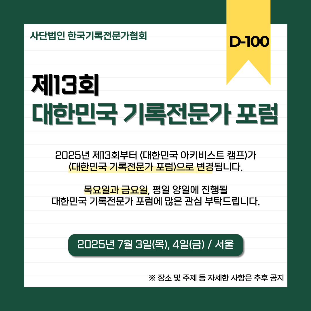 [공지] 제13회 대한민국 기록전문가 포럼((구)대한민국 아키비스트 캠프) 안내(D-100)