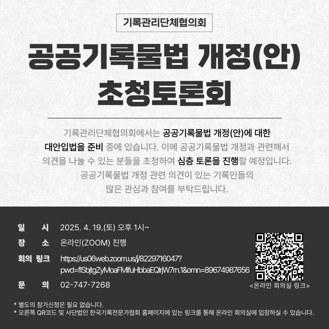 4월 19일 토요일 오후 1시에 기록관리단체협의회에서 주최하는 공공기록물법 개정(안) 초청토론회가 온라인으로 개최됩니다.