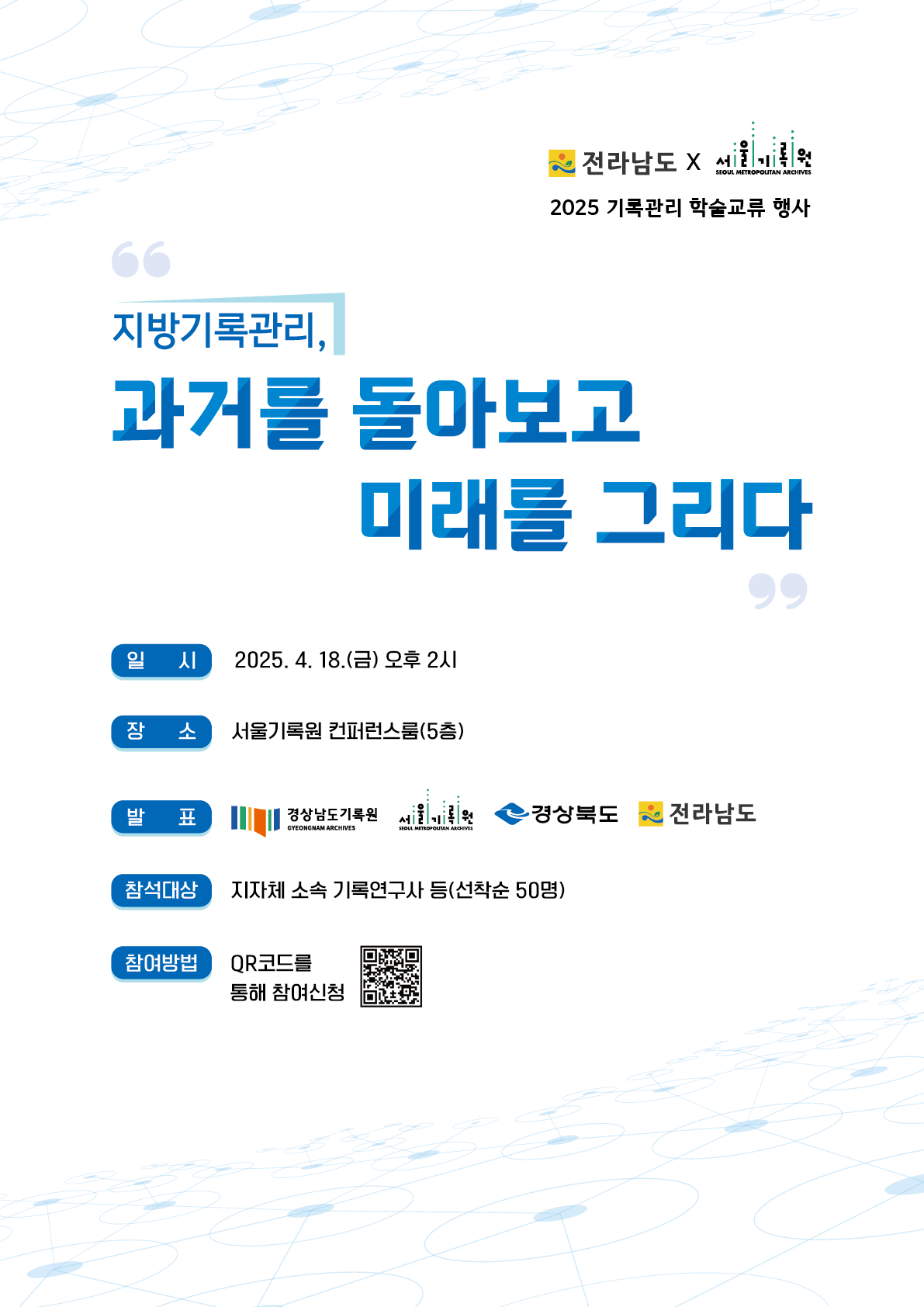 전라남도와 서울기록원이 주최하는 지방기록물관리 공동 학술 행사가 4월 18일(금)에 개최됩니다.