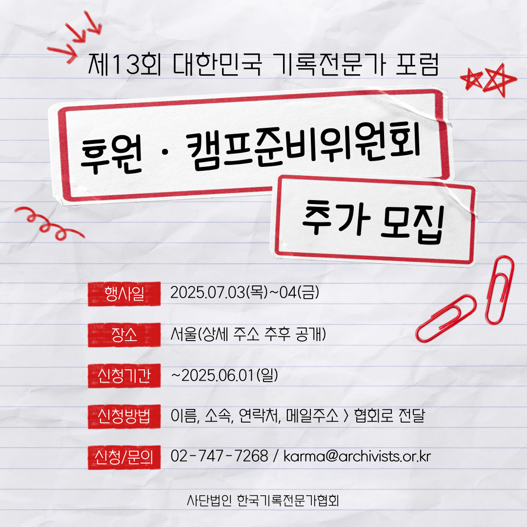 [공지] 제13회 대한민국 기록전문가 포럼 후원 및 캠프준비위원회 모집 안내(D-50)