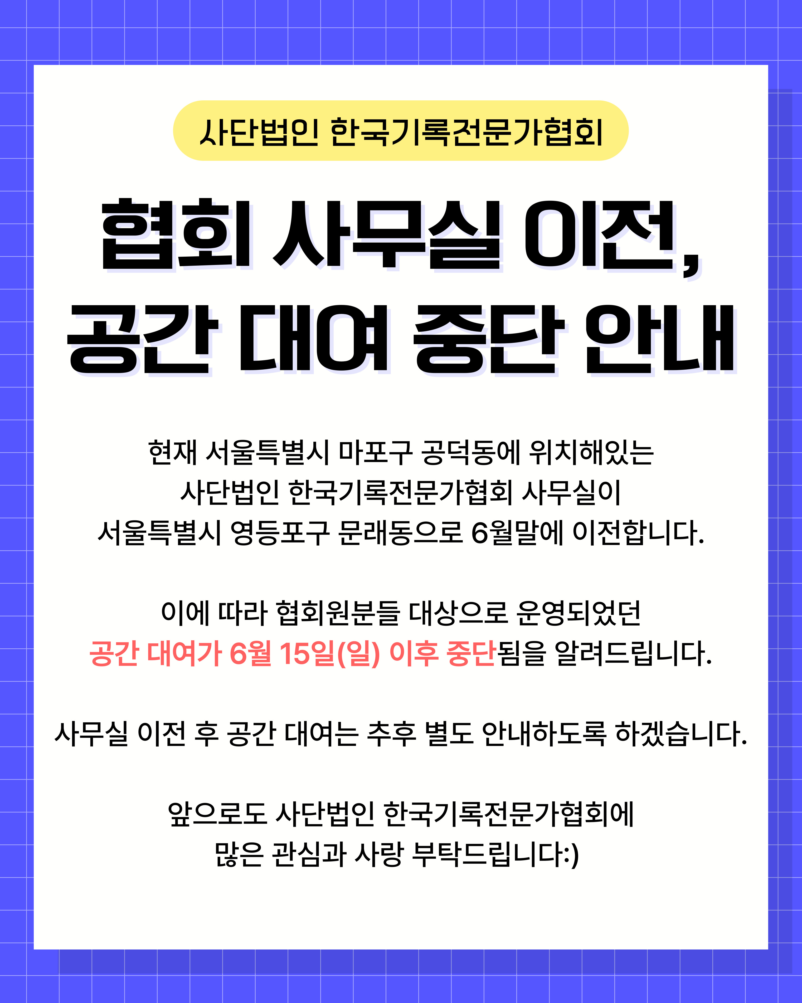 | [안내] 사단법인 한국기록전문가협회 사무실 이전 안내🎁 (0) | 2025.06.10 |
