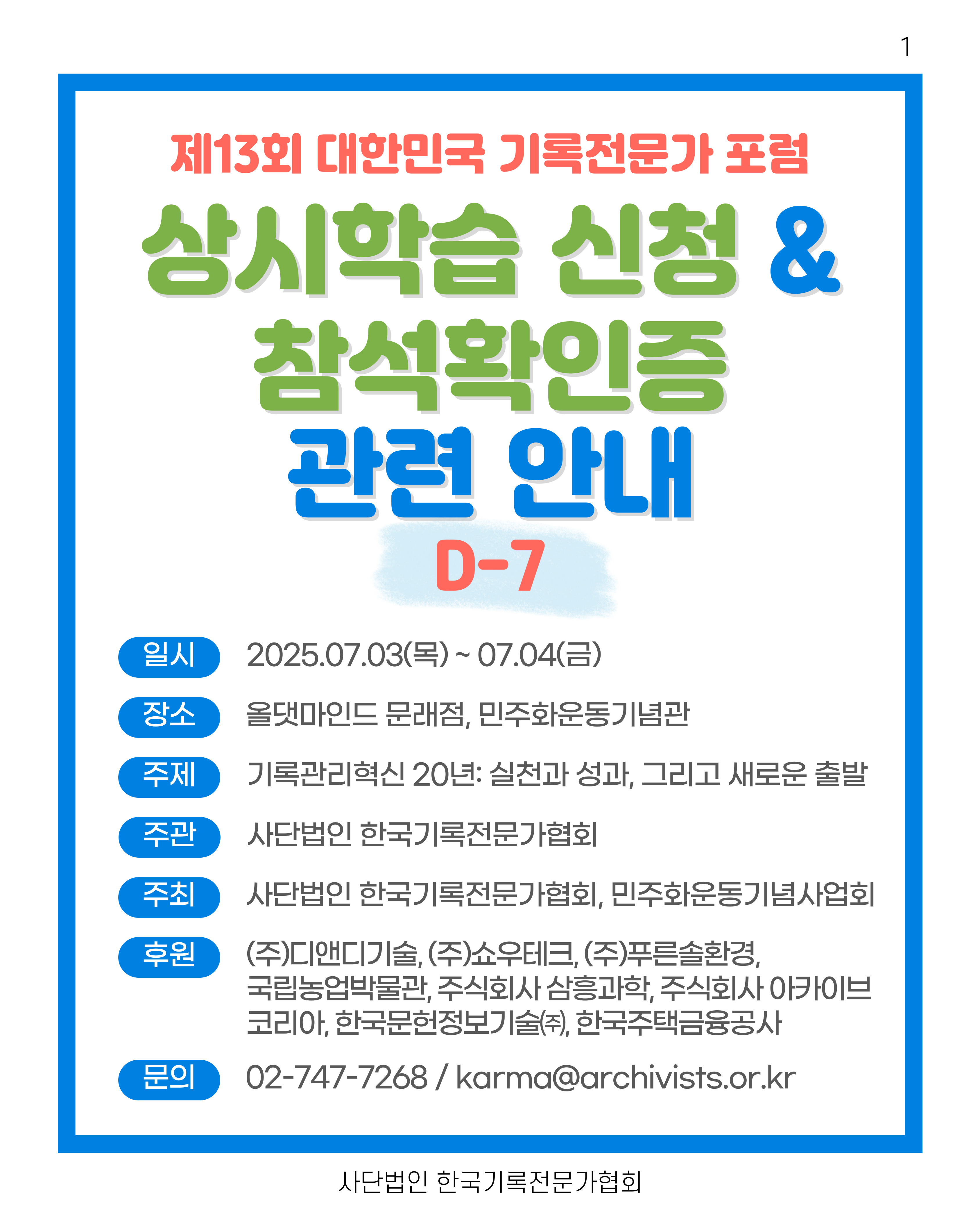 | [공지] 제13회 대한민국 기록전문가 포럼 공식 포스터 공개 및 사전참가신청 안내(D-15) (0) | 2025.06.18 |