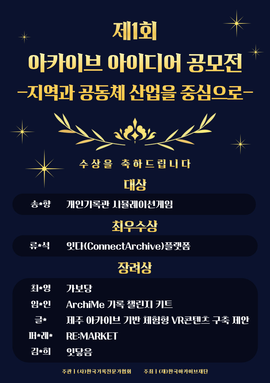 | [공지] 제1회 아카이브 아이디어 공모전 시상식 후기 (0) | 2025.07.09 |