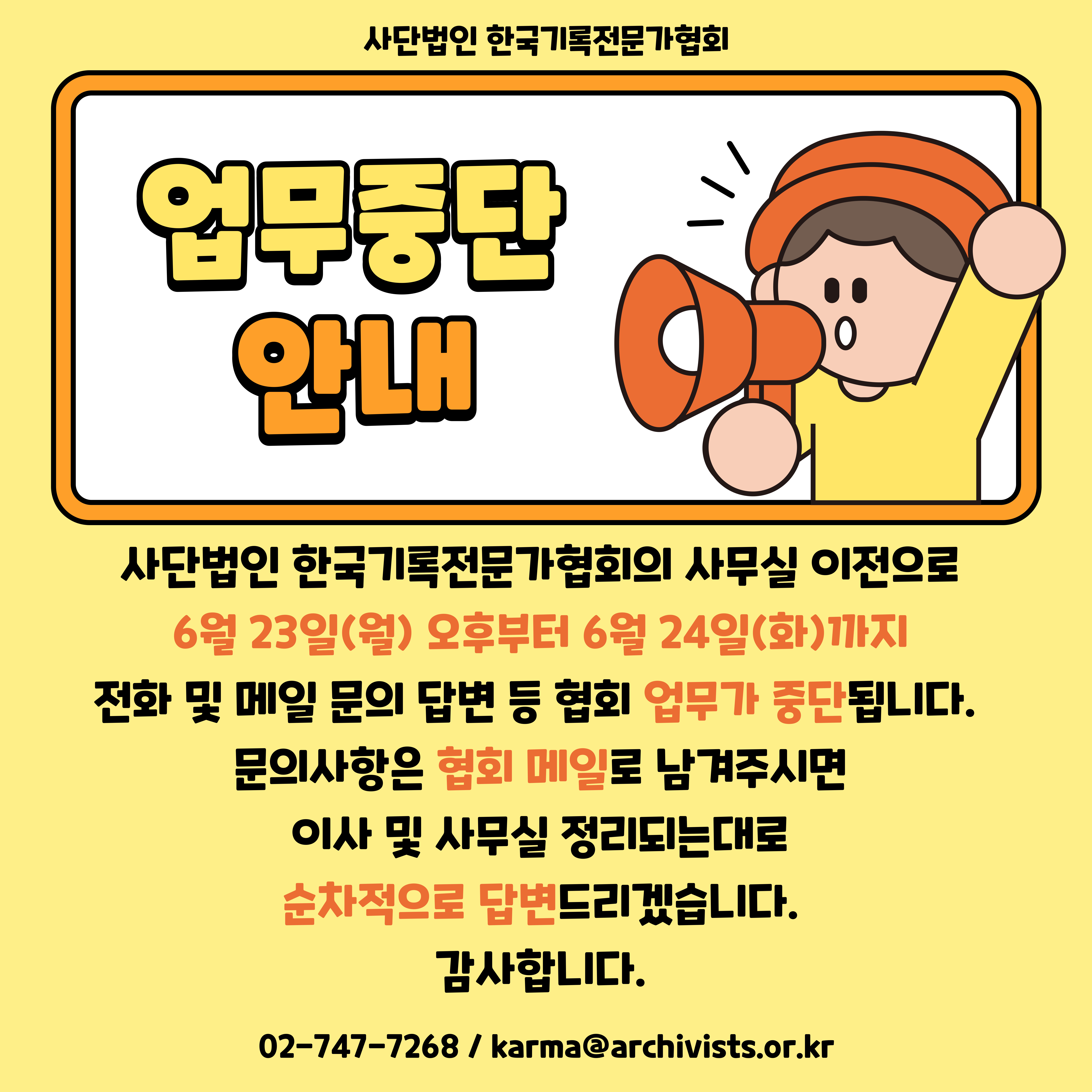 | [안내] 사단법인 한국기록전문가협회 사무실 이전 완료 및 주소 변경 안내 (0) | 2025.06.26 |
