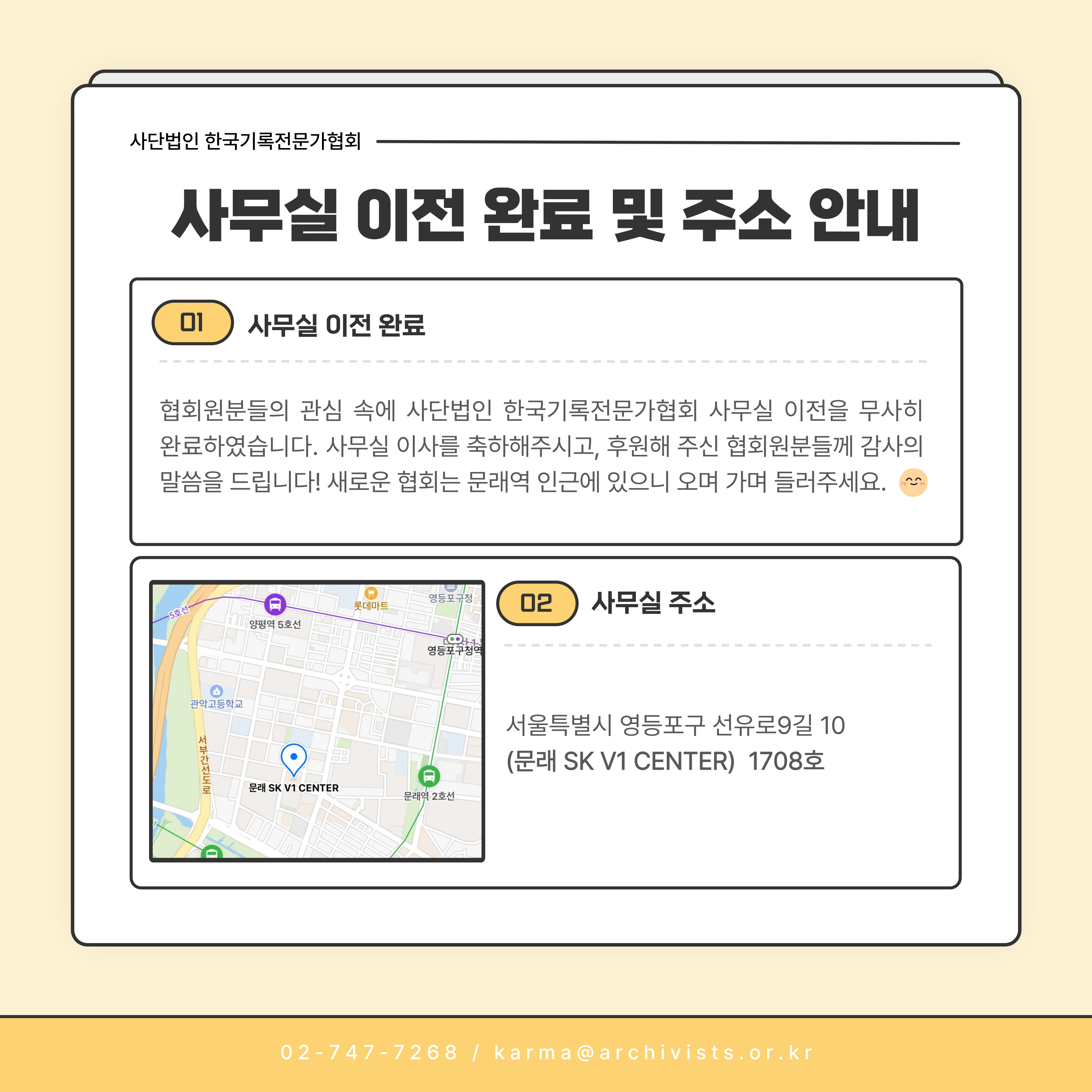 [안내] 사단법인 한국기록전문가협회 사무실 이전 완료 및 주소 변경 안내