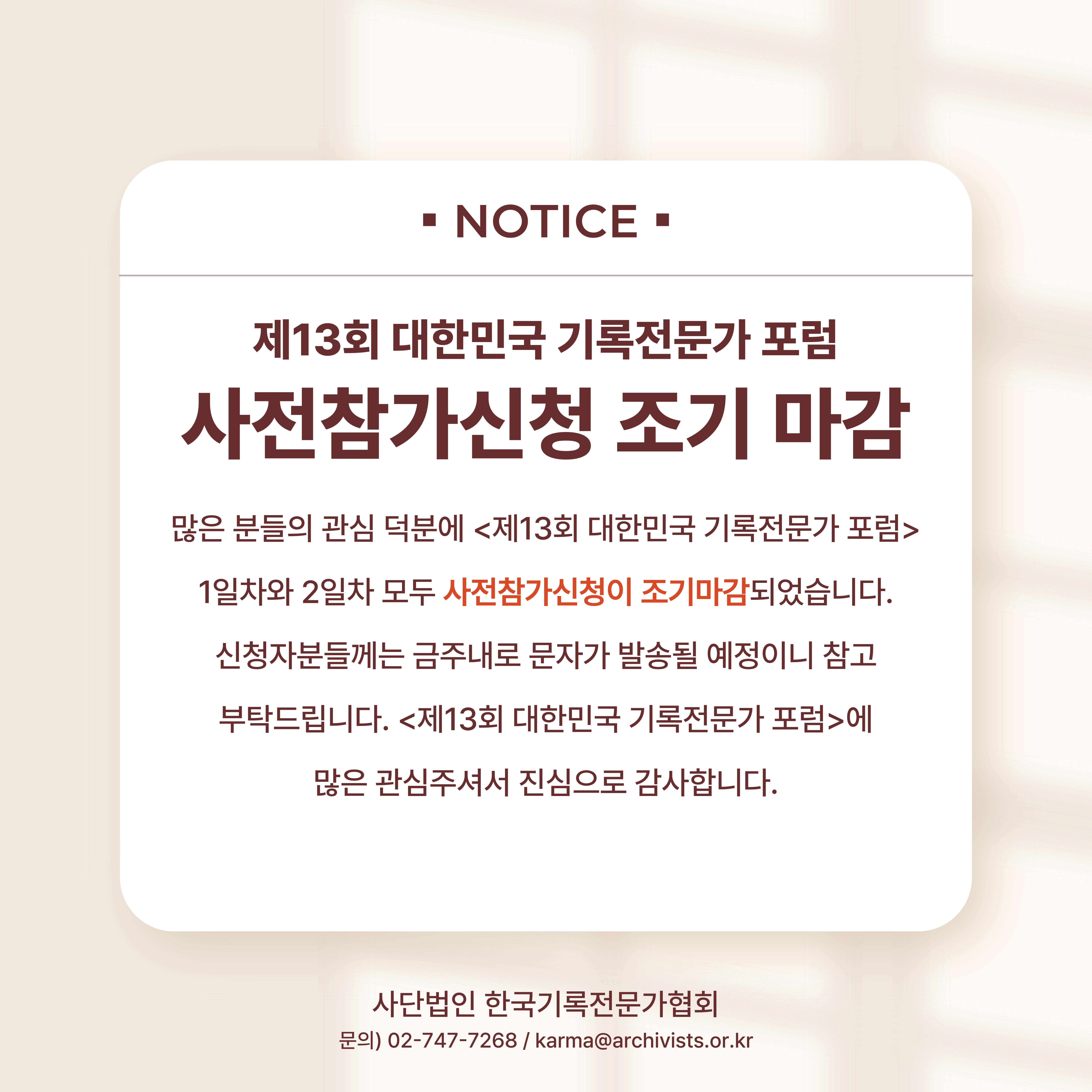 [공지] 제13회 대한민국 기록전문가 포럼 사전참가신청 조기마감 안내
