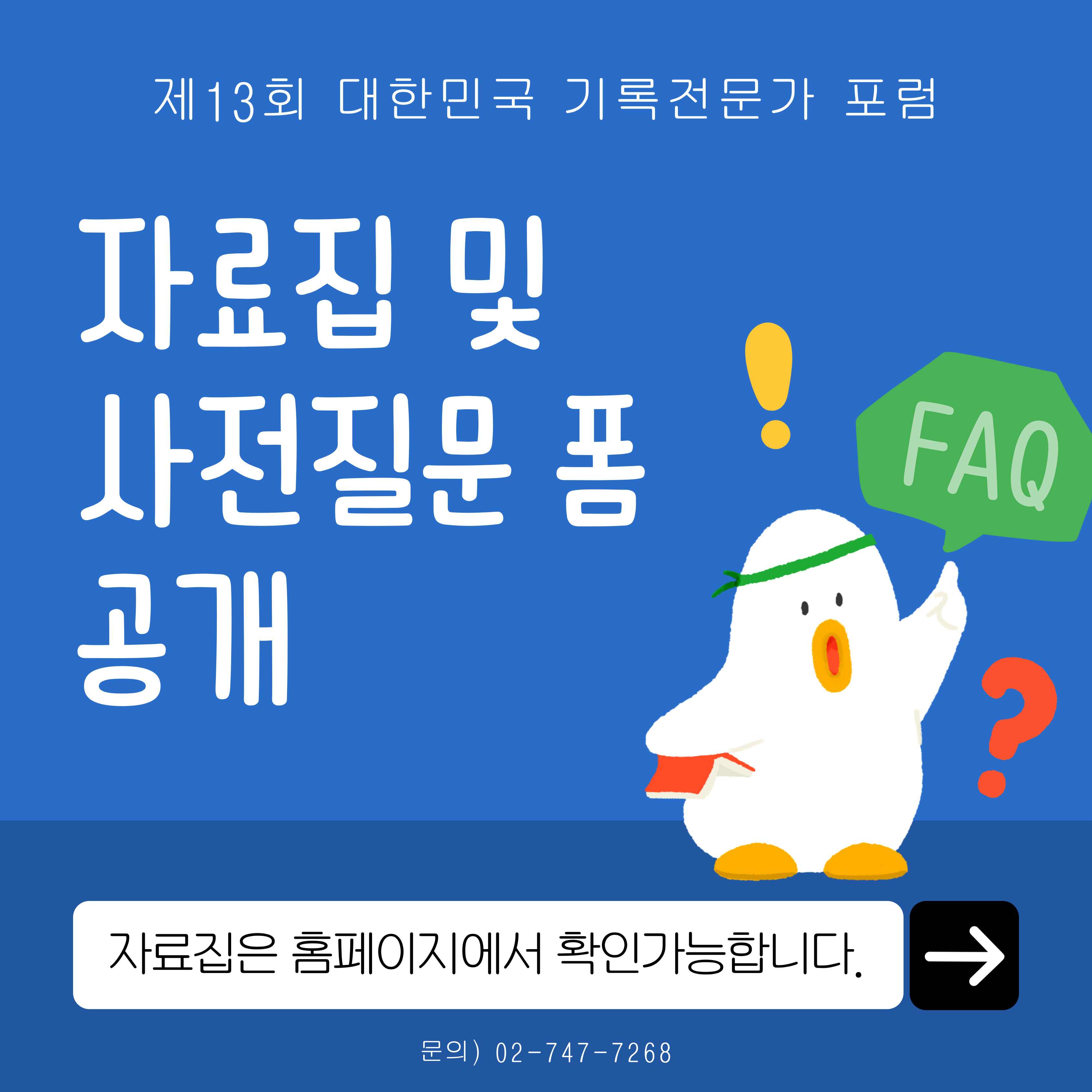 | [공지] 제13회 대한민국 기록전문가 포럼 공식 포스터 공개 및 사전참가신청 안내(D-15) (0) | 2025.06.18 |
