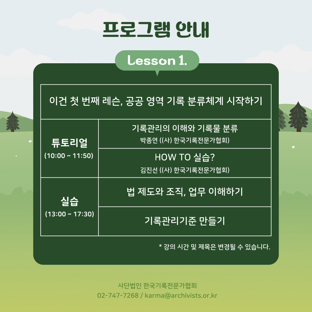 또한, Lesson 2.에는 다양한 기록 환경 속에서 분류를 통해 기록관리 업무가 어떻게 진행되는지에 대한 사례 발표가 있을 예정이며, 관련 안내는 추후에 공지하겠습니다.