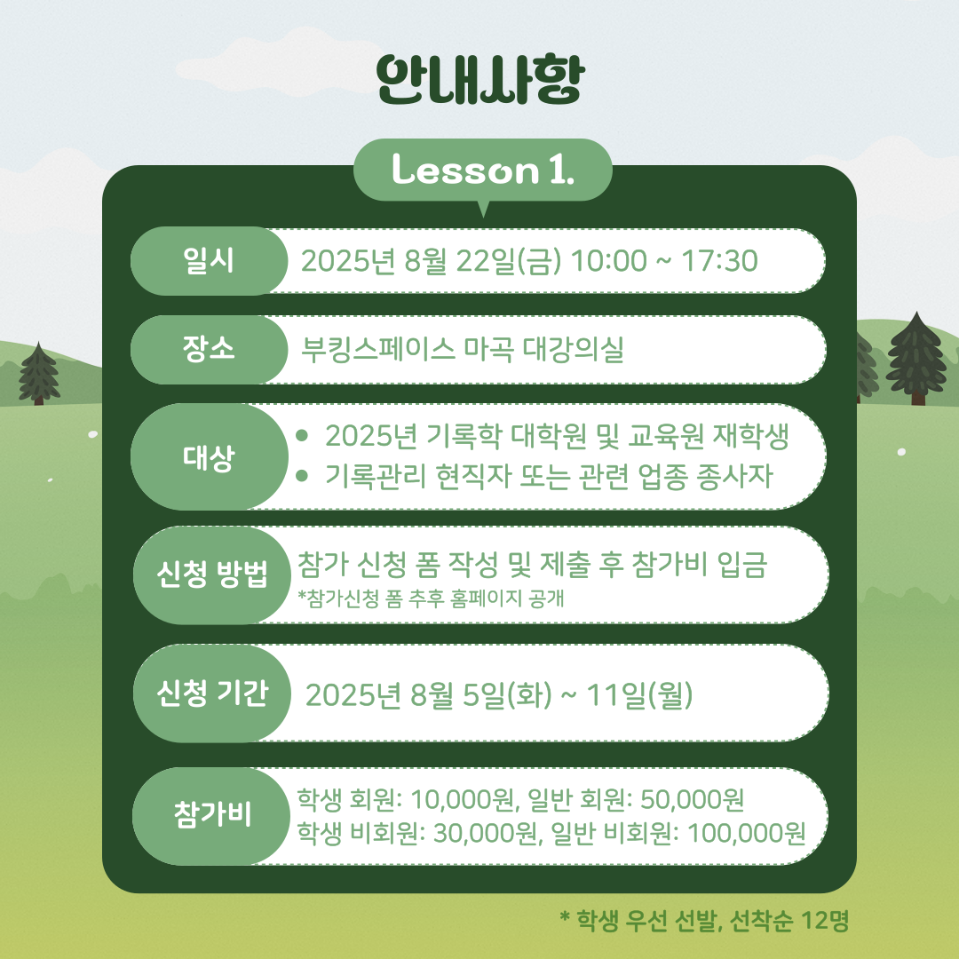 본 교육 프로그램은 기록문화 발전 및 진흥을 위해서 시민을 대상으로 진행하는 사업입니다. 올해 '기록의 숲'은 '기록학 예비학교'의 부재를 대신하여 Lesson 1.과 Lesson 2.로 나뉘어 진행됩니다.