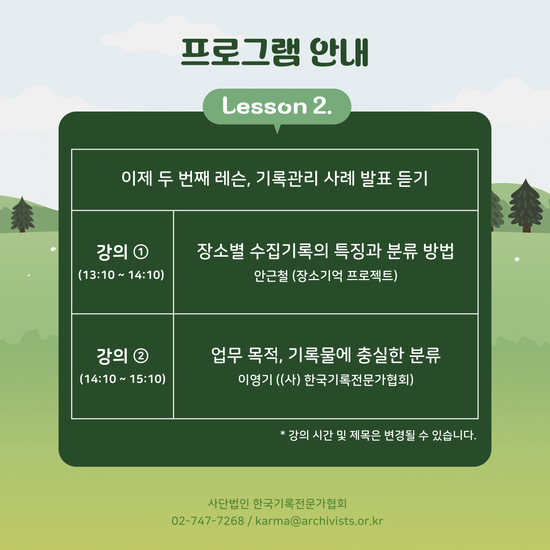 올해 <기록의 숲>은 기록관리 실습을 할 수 있는 'Lesson 1.'과, 올해 <기록학 예비학교>의 부재를 대신하여 현장 사례 발표를 들을 수 있는 'Lesson 2.'로 나누어 기획하였습니다.