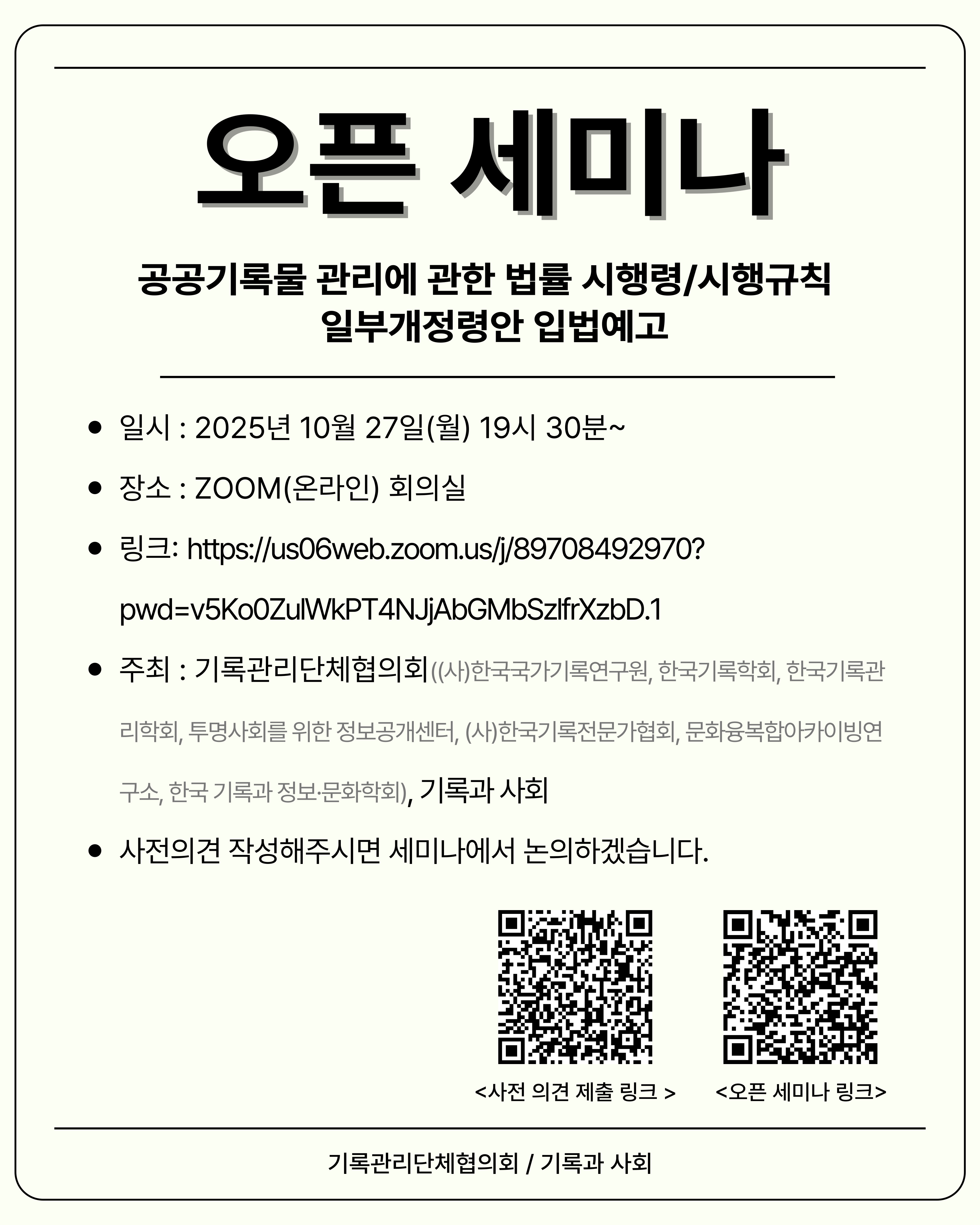 2025년 10월 27일 월요일 오후 7시 30분, 「공공기록물 관리에 관한 법률 시행령」및 「공공기록물 관리에 관한 법률 시행규칙」 일부개정령안 입법예고 관련 오픈 세미나가 온라인(ZOOM)으로 진행됩니다.