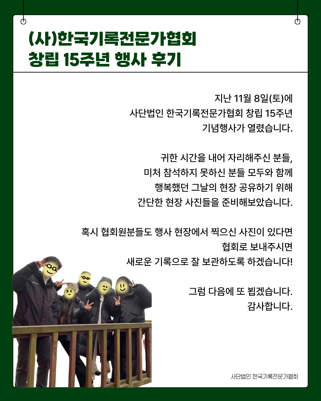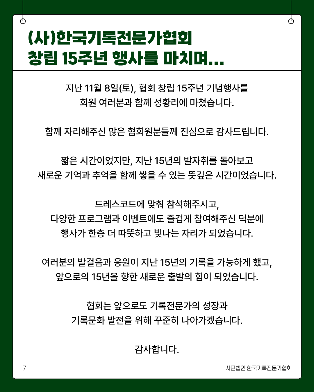 협회는 앞으로도 기록전문가의 성장과 기록문화 발전을 위해 꾸준히 나아가겠습니다.